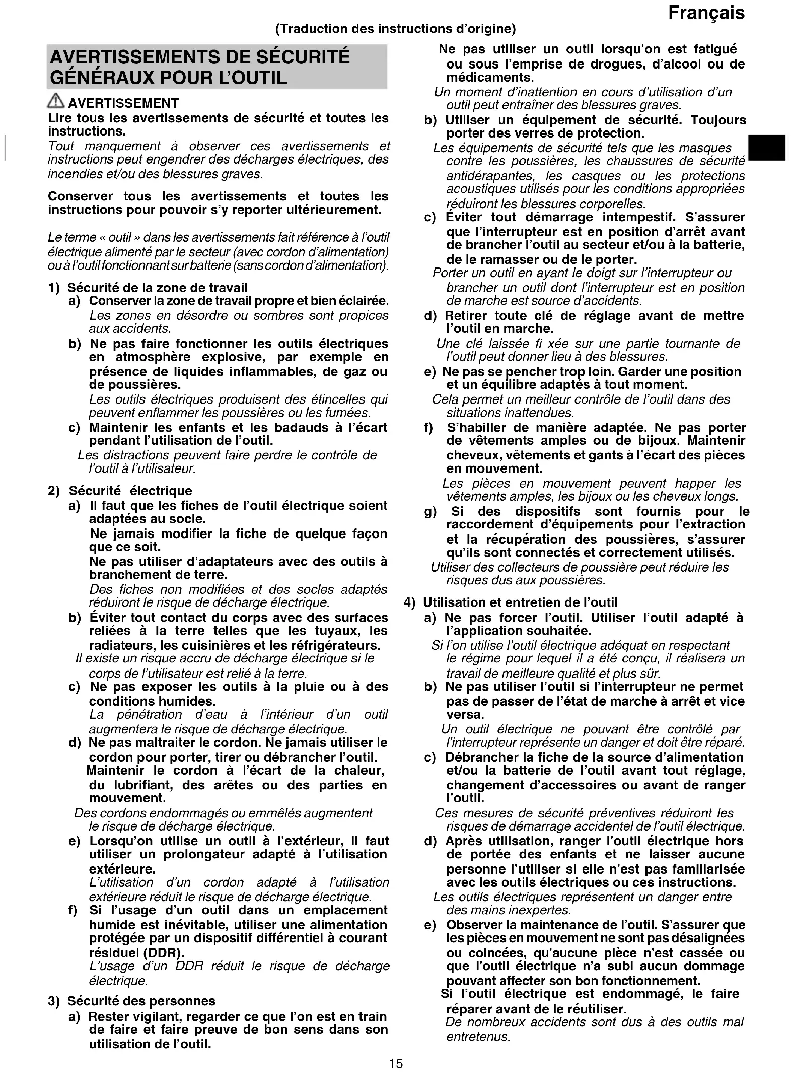 AVERTISSEMENT Lire tous les avertissements de sécurité et toutes les instructions. Tout manquement à observer ces avertissements et instructions peut engendrer des décharges électriques, des incendies et/ou des blessures graves. Conserver tous les avertissements et toutes les instructions pour pouvoir s’y reporter ultérieurement. Le terme « outil » dans les avertissements fait référence à l’outil électrique alimenté par le secteur (avec cordon d’alimentation) ou à l’outil fonctionnant sur batterie (sans cordon d’alimentation).