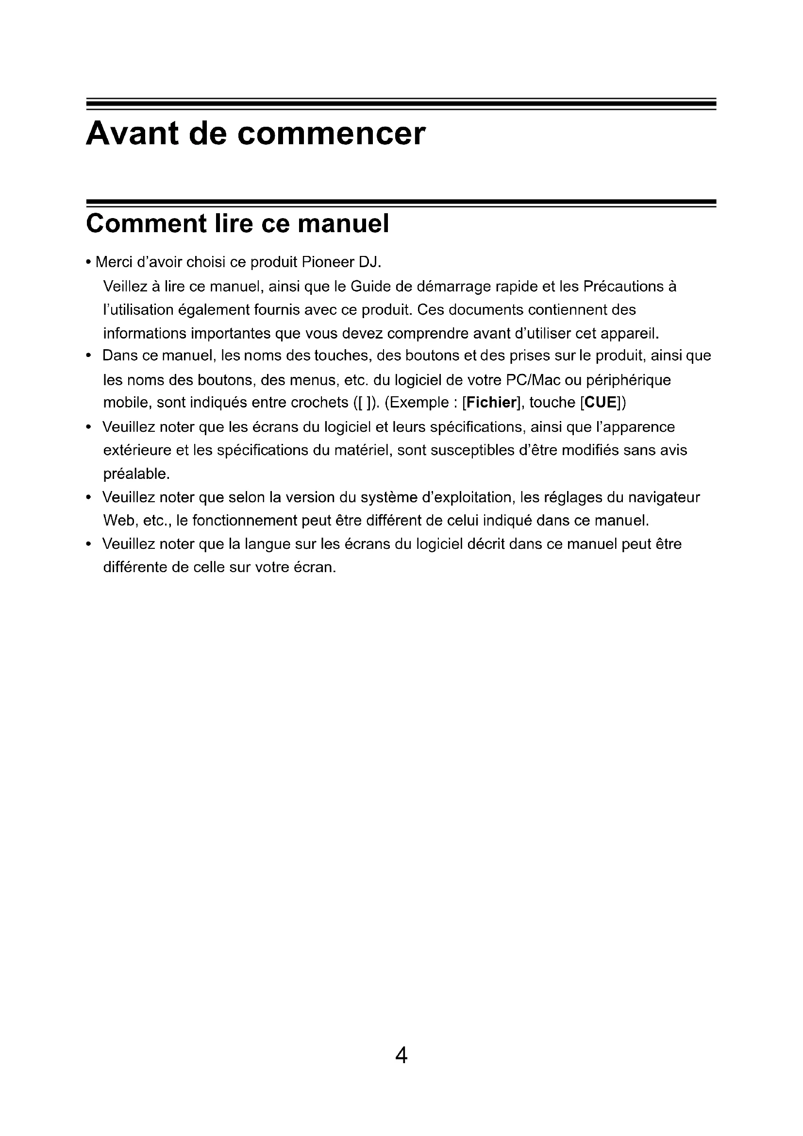 - Merci d’avoir choisi ce produit Pioneer DJ. Veillez à lire ce manuel, ainsi que le Guide de démarrage rapide et les Précautions à l’utilisation également fournis avec ce produit. Ces documents contiennent des informations importantes que vous devez comprendre avant d’utiliser cet appareil.