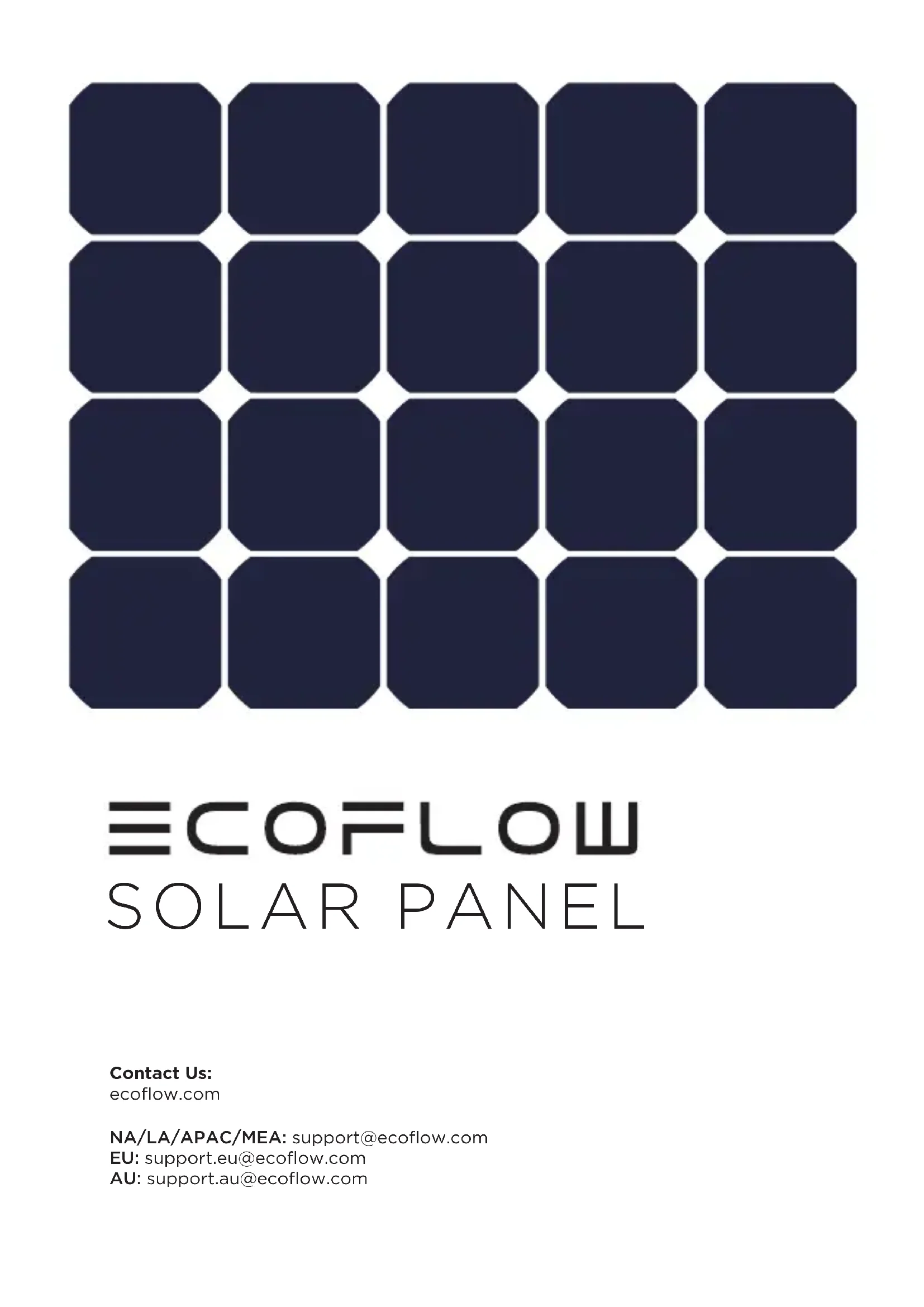 Contactez-nous: ecoflow.com NA/LA/APAC/MEA: support@ecoflow.com EU: support.eu@ecoflow.com AU: support.au@ecoflow.comContenu de la boîte Fonctionnement Mallette de protection etsupport Contrôleur de sortie MC4 EcoFlowRIVER (vendue séparément) EcoFlowRIVER (vendue séparément) EcoFlowDELTA (vendue séparément) EcoFlowDELTA (vendue séparément) Câble de charge solaire XT60 PORT D'ENTRÉE Panneau solaire Mousqueton x 4 Câble de charge solaire Panneau solaire Panneau solaire Manuel d'utilisation et carte de garantieVotre configuration solaire