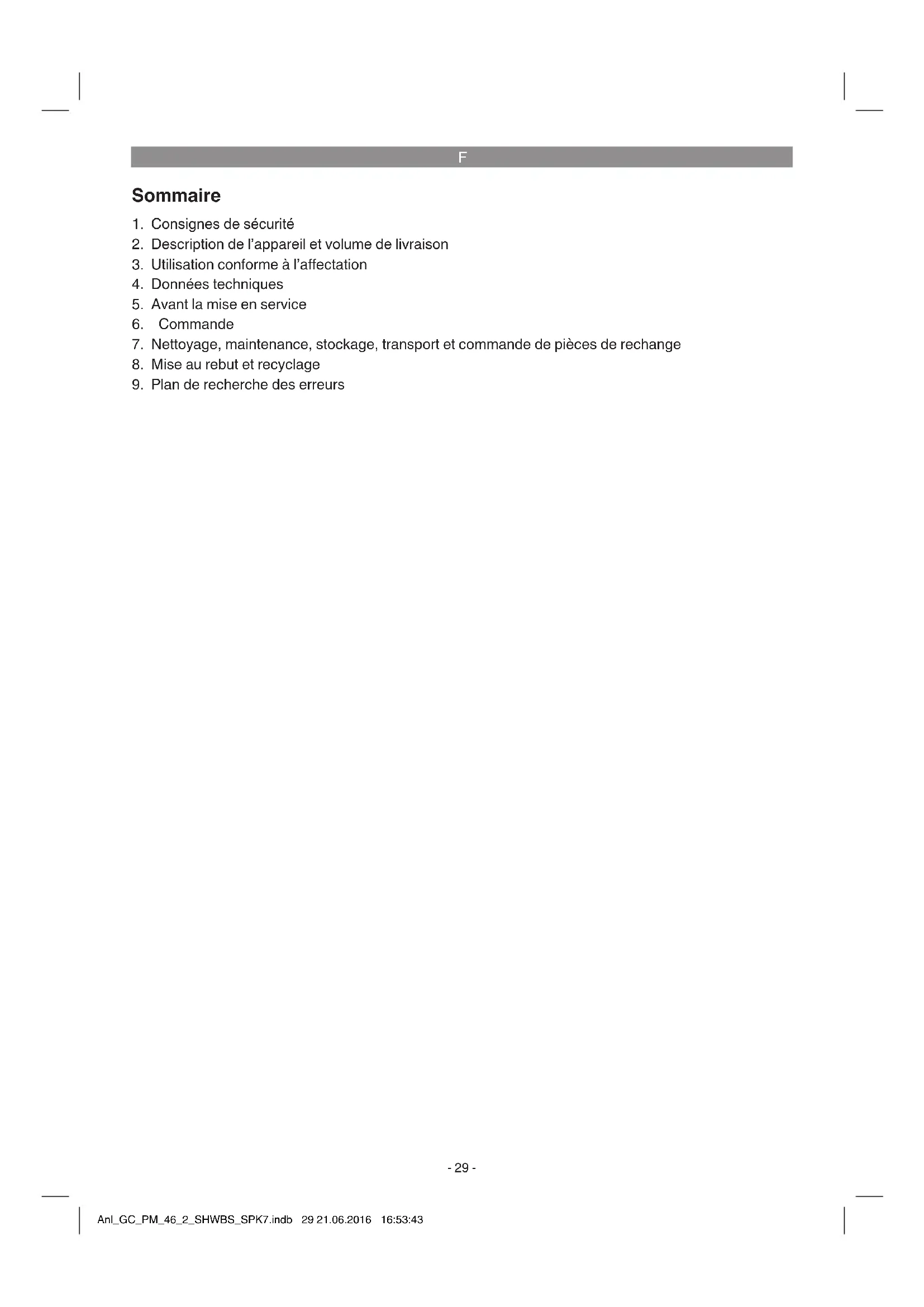 ivante : www.isc-gmbh.info. Veuillez garder à disposition la preuve d‘achat ou tout autre justicatif de l‘achat de votre nouvel appareil. Les appareils envoyés sans les justicatifs correspondants ou sans plaque signalétique sont exclus de la prestation de garantie en raison de l‘impossibilité de les enregistrer. Si le défaut de l‘appareil est inclut dans la garantie, vous recevrez sans délai un appareil réparé ou un nouvel appareil. Bien entendu, nous réparons volontiers les défauts de votre appareil qui ne sont pas ou plus compris dans l‘étendue de la garantie contre le remboursement des frais de réparation. Pour cela, veuillez envo- yer l‘appareil à notre adresse de service après-vente. Pour les pièces d‘usure, de consommation et manquantes, nous renvoyons aux restrictions de cette ga- rantie conformément aux informations du service après-vente de ce mode d‘emploi. Anl_GC_PM_46_2_SHWBS_SPK7.indb 39 21.06.2016 16:53:44II