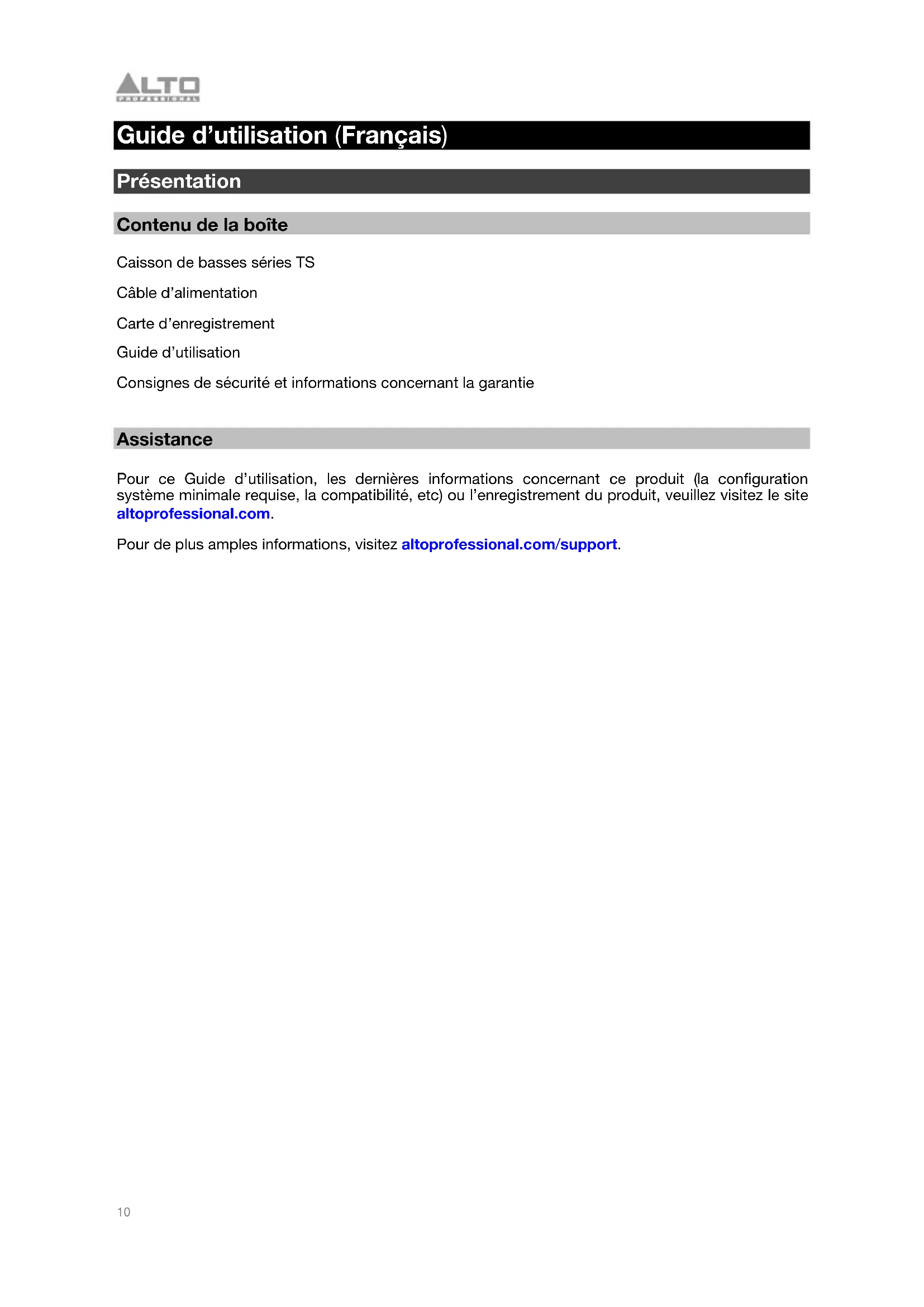 Assistance Pour ce Guide d’utilisation, les dernières informations concernant ce produit (la configuration système minimale requise, la compatibilité, etc) ou l’enregistrement du produit, veuillez visitez le site altoprofessional.com. Pour de plus amples informations, visitez altoprofessional.com/support.11