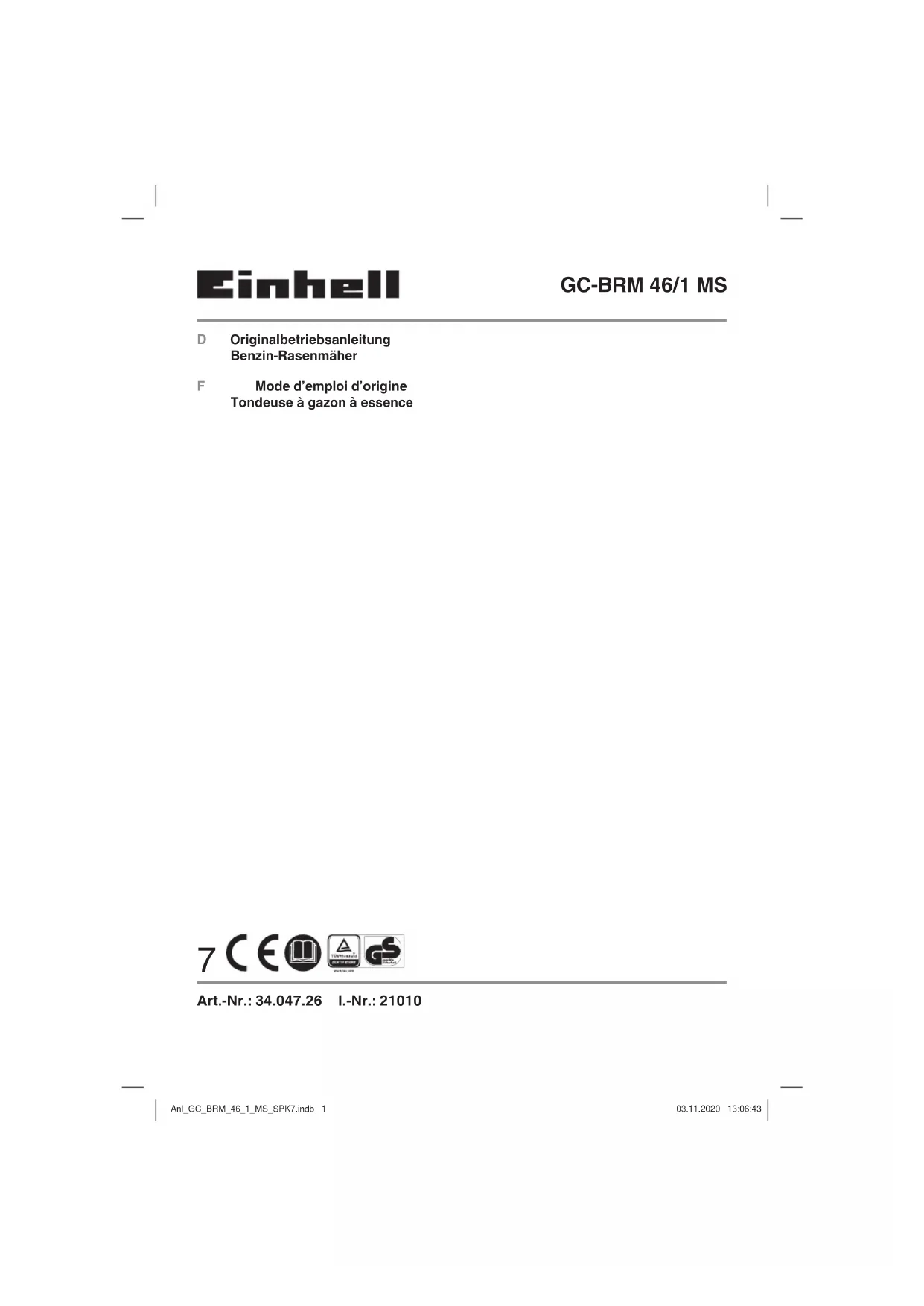 nutes, pensez que l‘échappement et d‘autres pièces sont brûlantes. Donc ne pas toucher afi n d‘éviter des brûlures. Dérangement Cause probable Élimination Course irrégulière, fortes vibrations de l‘appareil - Vis desserrées - Fixation de la lame desserrée - Lame non équilibrée - Vérifi ez les vis - Vérifi ez la fi xation de la lame - Remplacez la lame Moteur ne démarre pas - Levier de démarrage du moteur/Le- vier d‘arrêt du moteur non enfoncé - Mauvaise position de l‘accélérateur (si existant) - Bougie d‘allumage défectueuse - Réservoir de carburant vide - Pompe à carburant (Primer) non ac- tionnée (si existante) - - Enfoncez le levier de démarrage du moteur/levier d‘arrêt du moteur - Contrôlez le réglage (si existant) - Remplacez la bougie d‘allumage - Mettez du carburant - Actionnez la pompe à carburant (Primer) (si existante) Le moteur fonction- ne irrégulièrement - Filtre à air encrassé - Bougie d‘allumage encrassée - Nettoyage du fi ltre à air - Nettoyage de la bougie d‘allumage Le gazon jaunit, la coupe est irrégu- lière - La lame est émoussée - Hauteur de coupe trop basse - Vitesse de rotation du moteur trop faible - Aff ûtez la lame - Réglez à la bonne hauteur de coupe - Positionnez le levier de l‘accélérateur sur max. (si existant) L‘éjection d‘herbe est sale - Vitesse de rotation du moteur trop faible - Hauteur de coupe trop basse - La lame est usée - Le sac collecteur est bouché - Positionnez le levier de l‘accélérateur sur max. (si existant) - Réglez à la bonne hauteur de coupe - Remplacez la lame - Videz le sac collecteur Toute réimpression ou autre reproduction de la documentation et des papiers joints aux produits, même sous forme d‘extraits, est possible uniquement sous réserve de l‘autorisation expresse de la société Einhell Germany AG. Sous réserve de modifi cations techniques Anl_GC_BRM_46_1_MS_SPK7.indb 29Anl_GC_BRM_46_1_MS_SPK7.indb 29 03.11.2020 13:07:2203.11.2020 13:07:22F