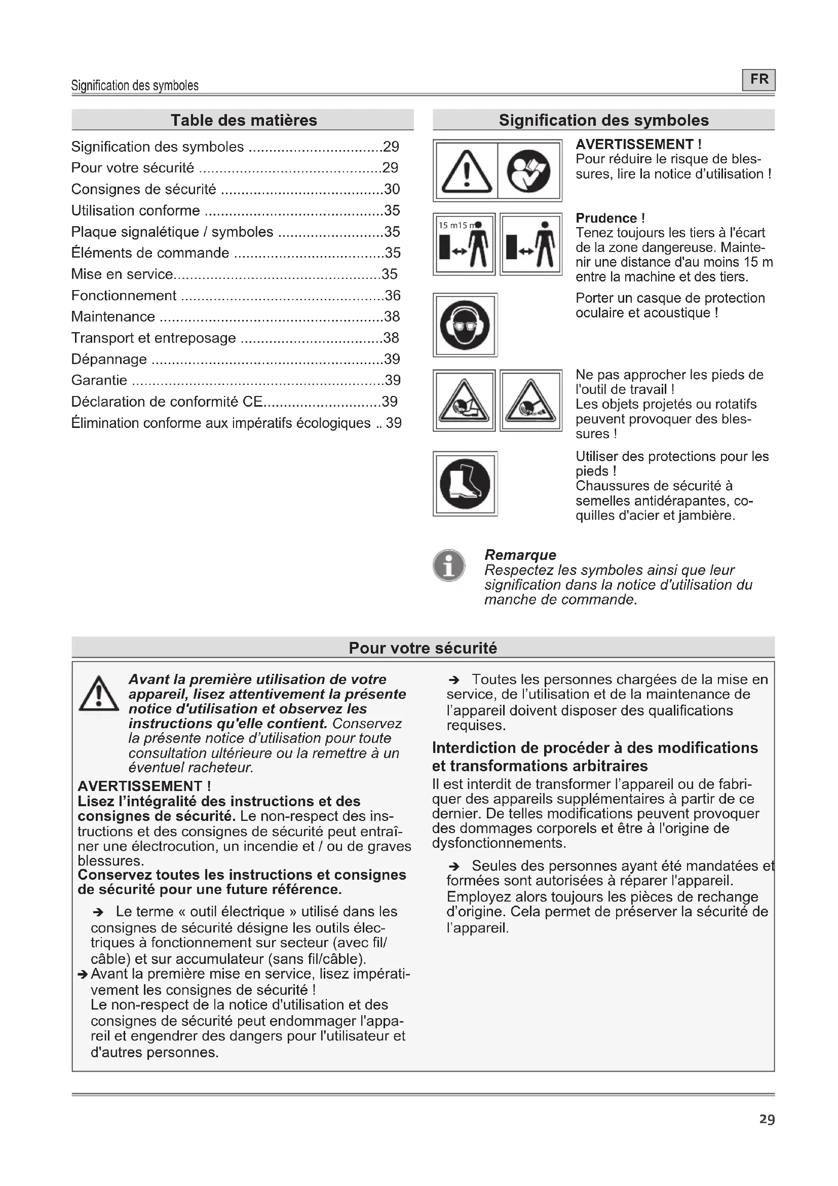 Signication des symboles AVERTISSEMENT ! Pour réduire le risque de bles- sures, lire la notice d’utilisation ! 15 m15 m Prudence ! Tenez toujours les tiers à l'écart de la zone dangereuse. Mainte- nir une distance d'au moins 15 m entre la machine et des tiers. Porter un casque de protection oculaire et acoustique ! Ne pas approcher les pieds de l'outil de travail ! Les objets projetés ou rotatifs peuvent provoquer des bles- sures ! Utiliser des protections pour les pieds ! Chaussures de sécurité à semelles antidérapantes, co- quilles d'acier et jambière. Remarque Respectez les symboles ainsi que leur signication dans la notice d'utilisation du manche de commande. Pour votre sécurité Avant la première utilisation de votre appareil, lisez attentivement la présente notice d'utilisation et observez les instructions qu'elle contient. Conservez la présente notice d’utilisation pour toute consultation ultérieure ou la remettre à un éventuel racheteur. AVERTISSEMENT ! Lisez l’intégralité des instructions et des consignes de sécurité. Le non-respect des ins- tructions et des consignes de sécurité peut entraî- ner une électrocution, un incendie et / ou de graves blessures. Conservez toutes les instructions et consignes de sécurité pour une future référence. Î Le terme « outil électrique » utilisé dans les consignes de sécurité désigne les outils élec- triques à fonctionnement sur secteur (avec l/ câble) et sur accumulateur (sans l/câble). Î Avant la première mise en service, lisez impérati- vement les consignes de sécurité ! Le non-respect de la notice d'utilisation et des consignes de sécurité peut endommager l'appa- reil et engendrer des dangers pour l'utilisateur et d'autres personnes. Î Toutes les personnes chargées de la mise en service, de l’utilisation et de la maintenance de l’appareil doivent disposer des qualications requises. Interdiction de procéder à des modifications et transformations arbitraires Il est interdit de transformer l’appareil ou de fabri- quer des appareils supplémentaires à partir de ce dernier. De telles modications peuvent provoquer des dommages corporels et être à l'origine de dysfonctionnements. Î Seules des personnes ayant été mandatées et formées sont autorisées à réparer l'appareil. Employez alors toujours les pièces de rechange d’origine. Cela permet de préserver la sécurité de l’appareil. Table des matièresPour votre sécurité