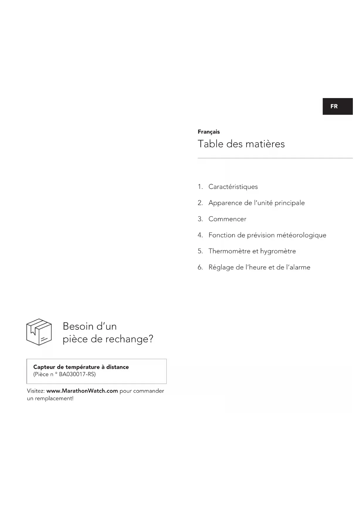 Berlin Station Météo avec Écran Couleur Weather Station with Colour Display Stazione Meteorologica con Display a Colori Wetterstation mit Farbdisplay Estación Meteorológica con Pantalla en Color Weerstation met kleurendisplay | FR | EN | IT | DE | ES | NL |FR Capteur de température à distance (Pièce n ° BA030017-RS) Besoin d’un pièce de rechange? Visitez: www.MarathonWatch.com pour commander un remplacement! Table des matières Français