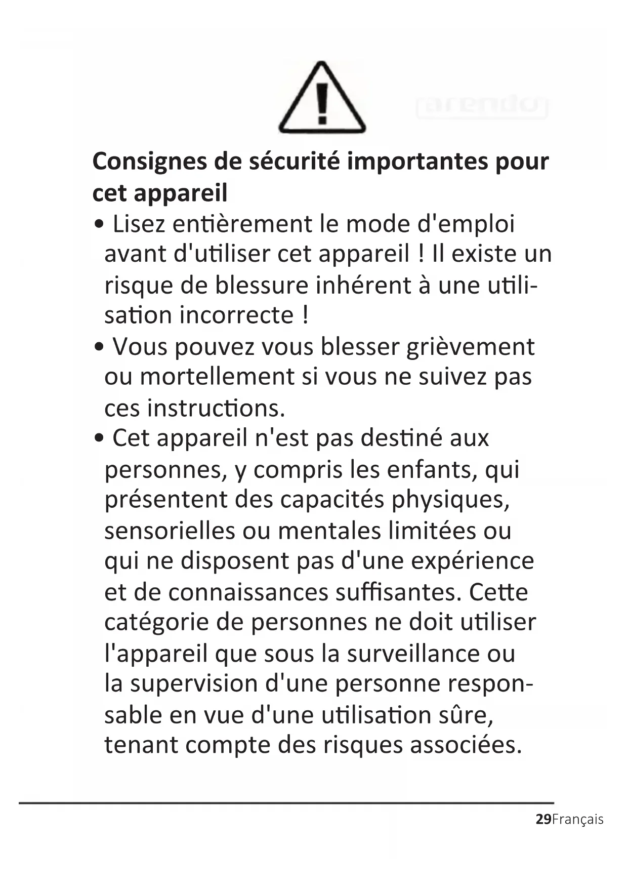 - Lisez enèrement le mode d'emploi avant d'uliser cet appareil ! Il existe un risque de blessure inhérent à une uli- saon incorrecte !
