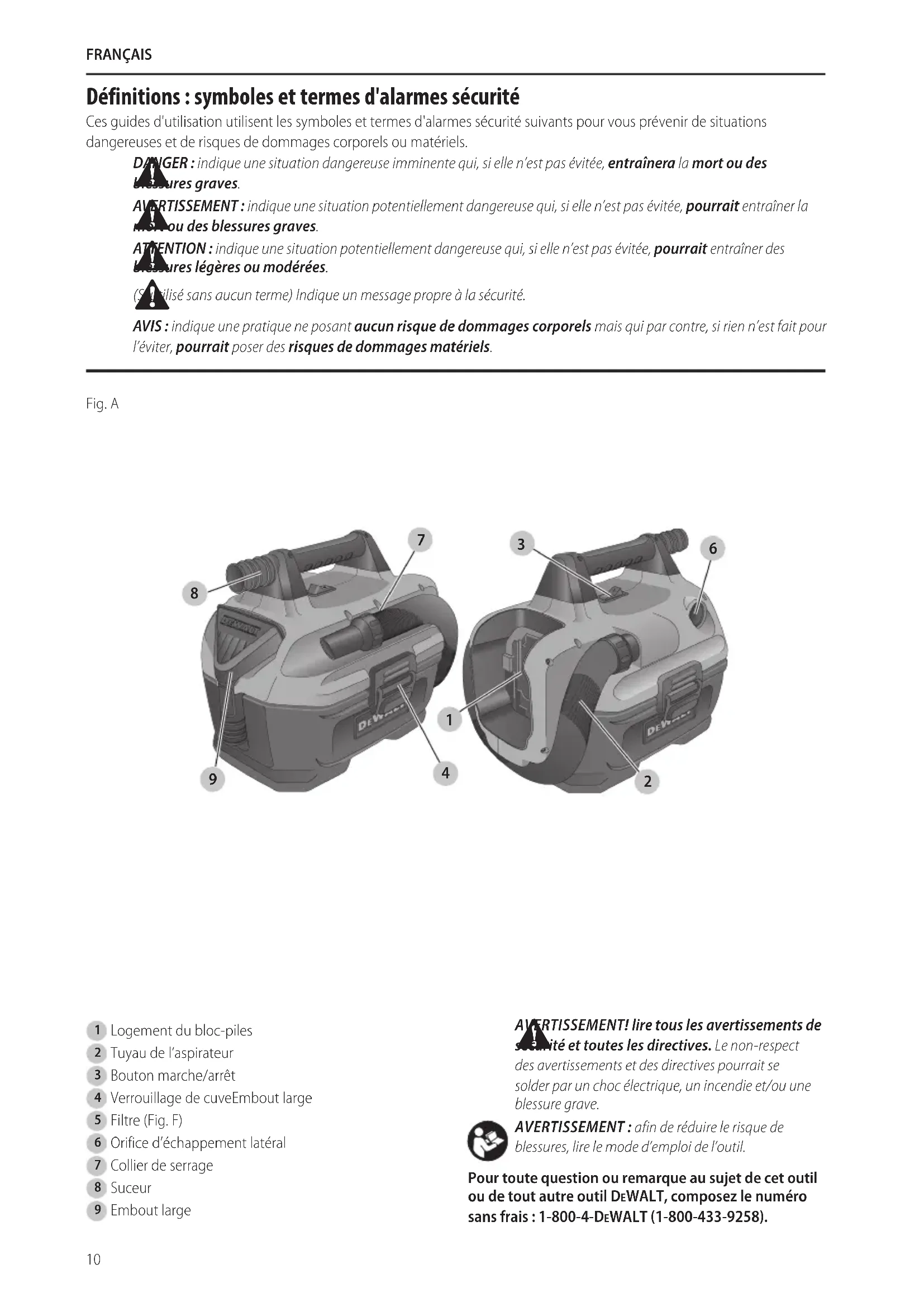 - Ne cherchez pas à réparer l’aspirateur. Pour assurer la sécurité et la fiabilité de ce produit, toutes les opérations de réparation, d’entretien et de réglage doivent être effectuées dans un centre de service autorisé ou par du personnel qualifiéDeWALT. Stockage du tuyau et des accessoires (Fig.A) Après utilisation de l’aspirateur, le tuyau peut être entouré autour de l’appareil, sous l’interface du bloc-piles, et arrimé à l’aide du collier de serrage