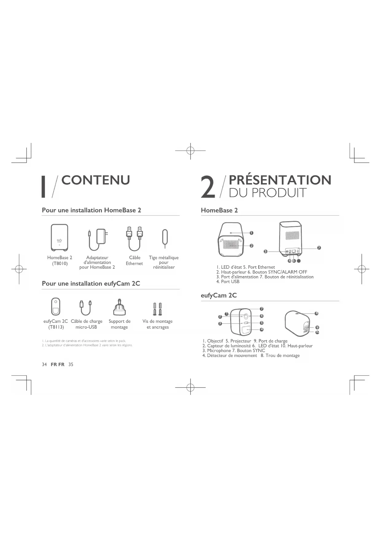 Montage de la caméra Charge de l'eufycam 2c34 FR FR 35 CONTENU Pour une installation HomeBase2 HomeBase 2 (T8010) Adaptateur d'alimentation pour HomeBase 2 Câble Ethernet Tige métallique pour réinitialiser Pour une installation eufyCam2C eufyCam 2C (T8113) Câble de charge micro-USB Support de montage Vis de montage et ancrages