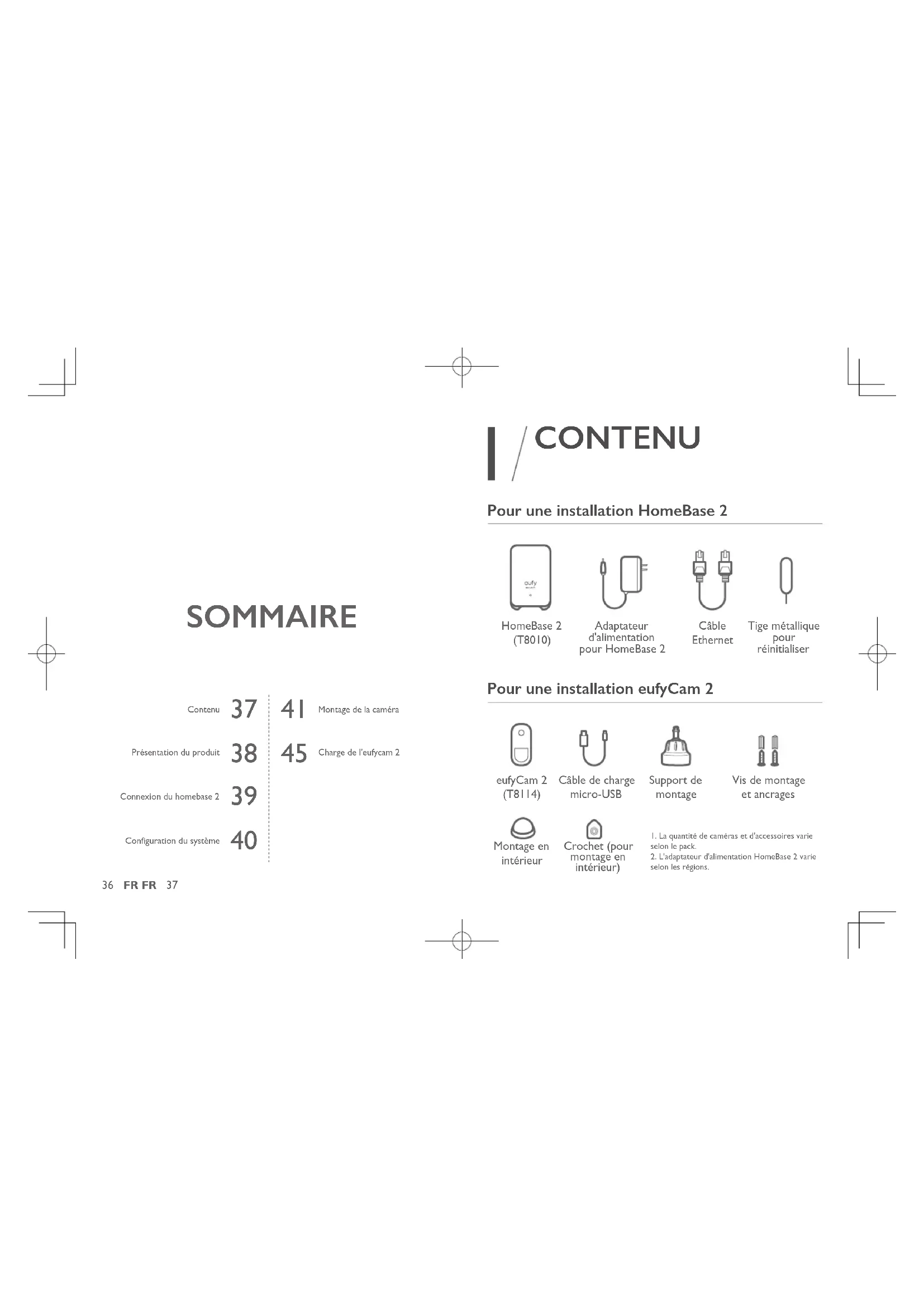 Charge de l'eufycam 2 CONTENU Pour une installation HomeBase2 HomeBase 2 (T8010) Adaptateur d'alimentation pour HomeBase 2 Câble Ethernet Tige métallique pour réinitialiser Pour une installation eufyCam2 eufyCam 2 (T8114) Câble de charge micro-USB Support de montage Vis de montage et ancrages Montage en intérieur Crochet (pour montage en intérieur) 1. La quantité de caméras et d'accessoires varie selon le pack. 2. L'adaptateur d'alimentation HomeBase 2 varie selon les régions.38 FR FR 39 PRÉSENTATION DU PRODUIT HomeBase 2