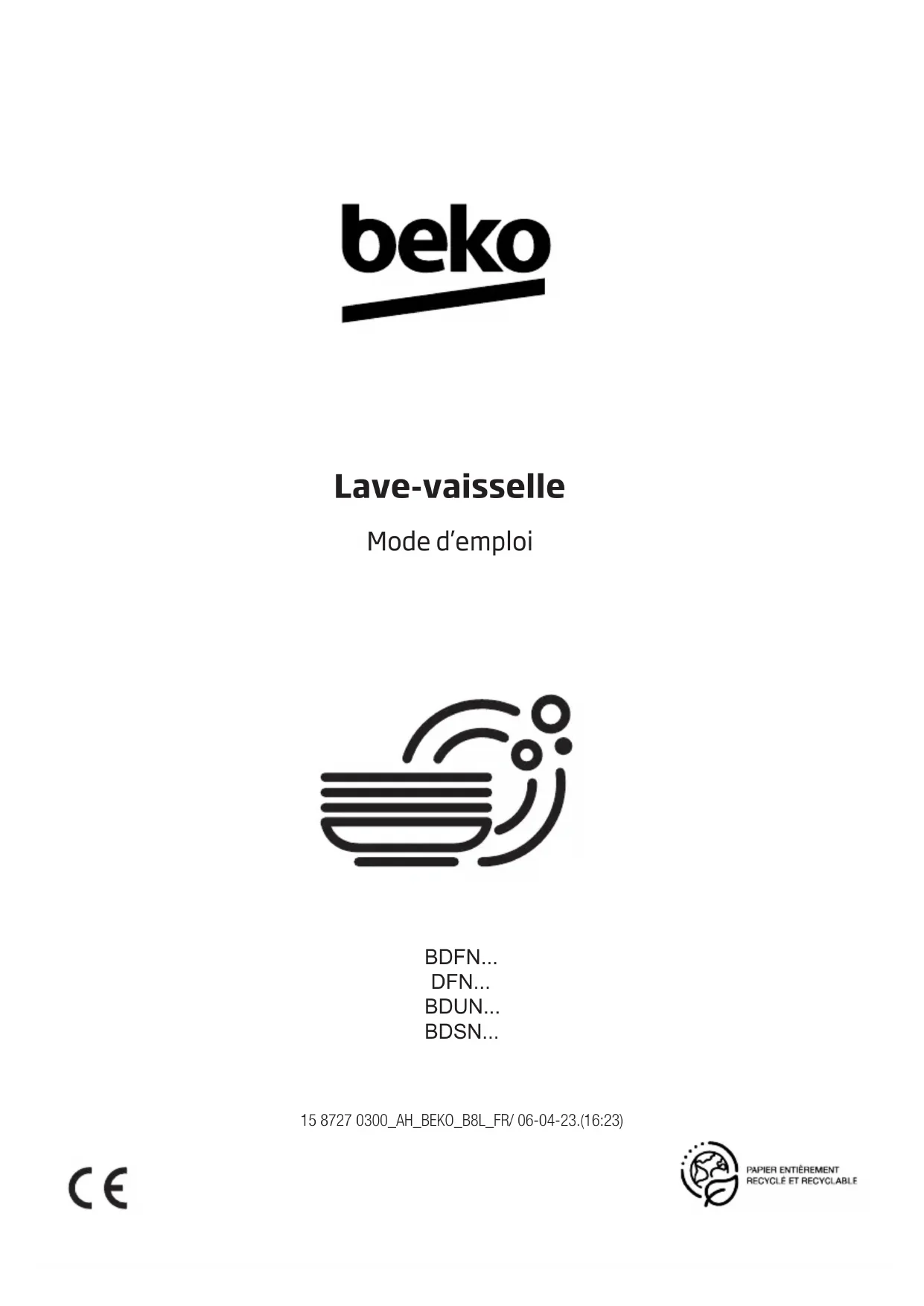 Lave-vaisselle Mode d’emploi 15 8727 0300_AH_BEKO_B8L_FR/ 06-04-23.(16:23) BDFN... DFN... BDUN... BDSN...Les symboles suivants sont utilisés dans le manuel d’utilisation et sur l’emballage : Danger pouvant entraîner des blessures voire la mort. AVIS Danger pouvant entraîner des dommages au produit ou à son environnement. Informations importantes ou conseils utiles pour l’utilisation Veuillez lire ce manuel d’utilisateur. Cher client, Veuillez lire le présent manuel d’utilisation avant d’utiliser le produit. Merci d’avoir choisi ce produit Beko. Nous espérons que vous obtiendrez les meilleurs résultats avec notre produit fabriqué à partir d’une technologie de pointe et de matériaux de qualité supérieure. C’est pourquoi nous vous recommandons, avant d’utiliser ce produit, de lire attentivement ce manuel et tous les autres documents fournis. Veillez à bien respecter les consignes et les instructions figurant dans le manuel d’utilisation. Ainsi, vous pouvez vous protéger et protéger votre produit contre les dangers potentiels. Veuillez conserver ce manuel d’utilisateur. Si vous confiez le produit à quelqu’un d’autre, n’oubliez pas de lui remettre également le manuel d’utilisation. Ce produit a été fabriqué conformément aux conditions écologiques les plus récentes.TABLE DES MATIÈRES
