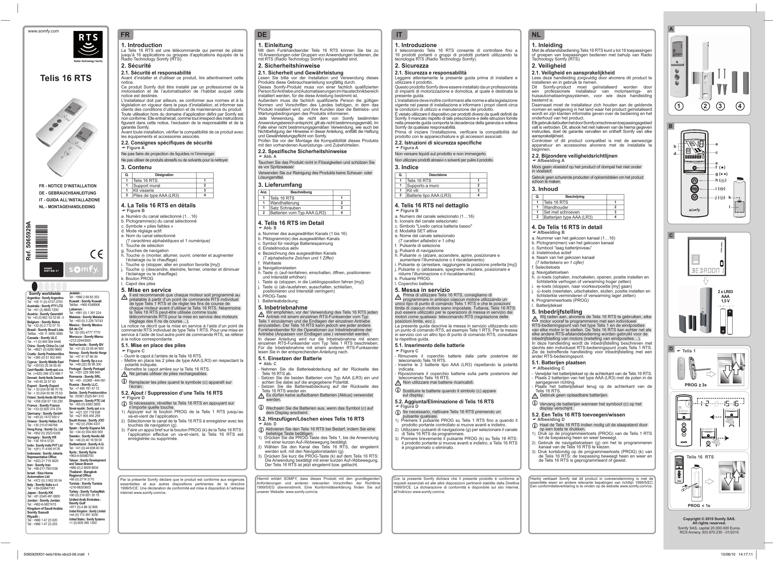 Il est recommandé que chaque moteur soit programmé au préalable à partir d’un point de commande RTS individuel de type Telis 1 RTS et de régler les fins de course de chaque moteur avant d’utiliser la Telis 16 RTS. Néanmoins la Telis 16 RTS peut-être utilisée comme toute télécommande RTS pour la mise en service des moteurs (réglage des fi ns de course…). La notice ne décrit que la mise en service à l’aide d’un point de commande RTS individuel de type Telis 1 RTS. Pour une mise en service à l’aide de tout autre point de commande RTS, se référer à la notice correspondante. 5.1. Mise en place des piles A Figure C - Ouvrir le capot à l’arrière de la Telis 16 RTS. - Mettre en place les 2 piles de type AAA (LR3) en respectant la polarité indiquée. - Remettre le capot arrière sur la Telis 16 RTS. Ne jamais utiliser de piles rechargeables. Remplacer les piles quand le symbole (c) apparaît sur l’écran. 5.2. Ajout / Suppression d’une Telis 16 RTS A Figure D Si nécessaire, réveiller la Telis 16 RTS en appuyant sur n’importe quelle touche.