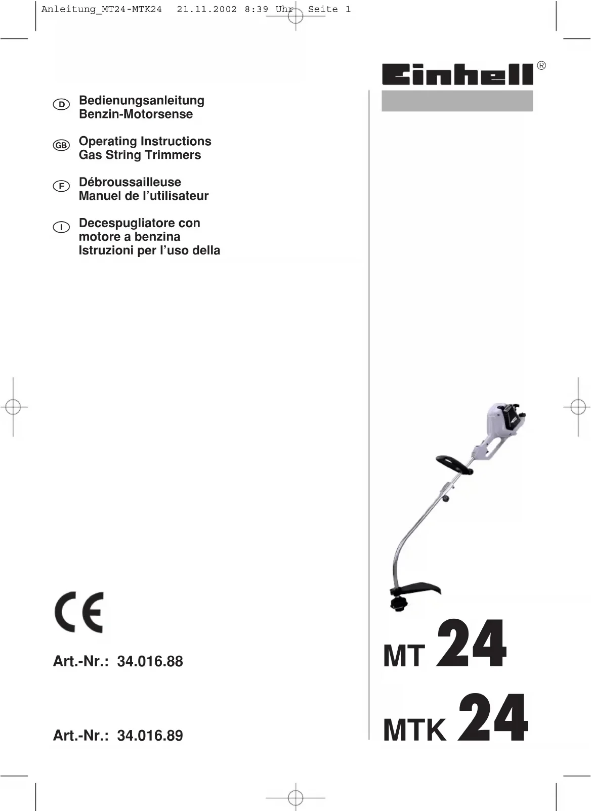 MTK 24 - Coupe-herbe EINHELL - Notice d'utilisation et mode d'emploi gratuit