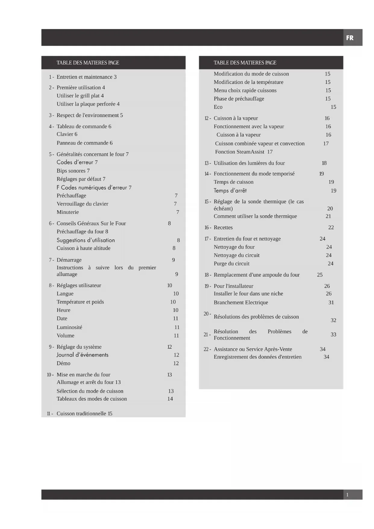 - le système à une mise à la terre efficace conforme aux normes et aux lois en vigueur La connexion à la terre est requise par la loi. Le câble ne doit jamais atteindre une température supérieure à 50°C au-dessus de la température ambiante. Ce four doit être branché à l'électricité avec un câble électrique et une fiche compatibles avec la prise de courant du système électrique qui alimente le four. Si un appareil fixé ne dispose ni d'un câble électrique ni d'une prise ou si un autre dispositif qui garantit le sectionnement du secteur, avec une distance d'ouverture des contacts permettant une coupure complète dans des conditions de tension excessive de catégorie III, ces dispositifs de sectionnement doivent être installés sur la ligne d'alimentation électrique principale (secteur) conformément aux règles d'installation. La prise ou l'interrupteur omnipolaire doivent être à portée de main quand l'appareil est installé. Remarque : Le fabricant décline toute responsabilité si les normes habituelles de prévention des accidents et les instructions ci-dessus n'ont pas été respectées. TYPE DE CABLES ET LEUR DIAMETRE MINIMUM SASO H05RR-F 3x1,5 mm² H05RR-F 3x2,5 mm² H05VV-F 3x1,5 mm² H05VV-F 3x2,5 mm² H05RN-F 3x1,5 mm² H05RN-F 3x2,5 mm² H05V2V2-F 3x1,5 mm² H05V2V2-F 3x2,5 mm²FR