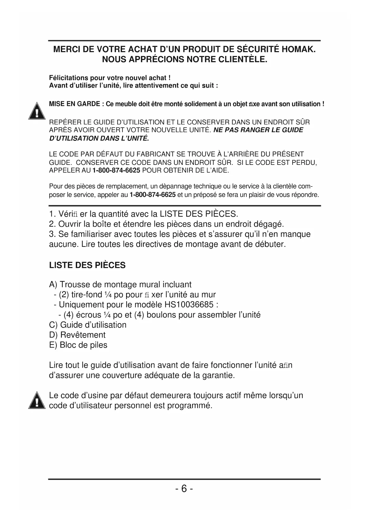 MERCI DE VOTRE ACHAT D’UN PRODUIT DE SÉCURITÉ HOMAK. NOUS APPRÉCIONS NOTRE CLIENTÈLE. Félicitations pour votre nouvel achat ! Avant d’utiliser l’unité, lire attentivement ce qui suit : MISE EN GARDE : Ce meuble doit être monté solidement à un objet fi xe avant son utilisation ! REPÉRER LE GUIDE D’UTILISATION ET LE CONSERVER DANS UN ENDROIT SÛR APRÈS AVOIR OUVERT VOTRE NOUVELLE UNITÉ. NE PAS RANGER LE GUIDE D’UTILISATION DANS L’UNITÉ. LE CODE PAR DÉFAUT DU FABRICANT SE TROUVE À L’ARRIÈRE DU PRÉSENT GUIDE. CONSERVER CE CODE DANS UN ENDROIT SÛR. SI LE CODE EST PERDU, APPELER AU 1-800-874-6625 POUR OBTENIR DE L’AIDE. Pour des pièces de remplacement, un dèpannage technique ou le service à la clientèle com- poser le service, appeler au 1-800-874-6625 et un préposé se fera un plaisir de vous répondre.
