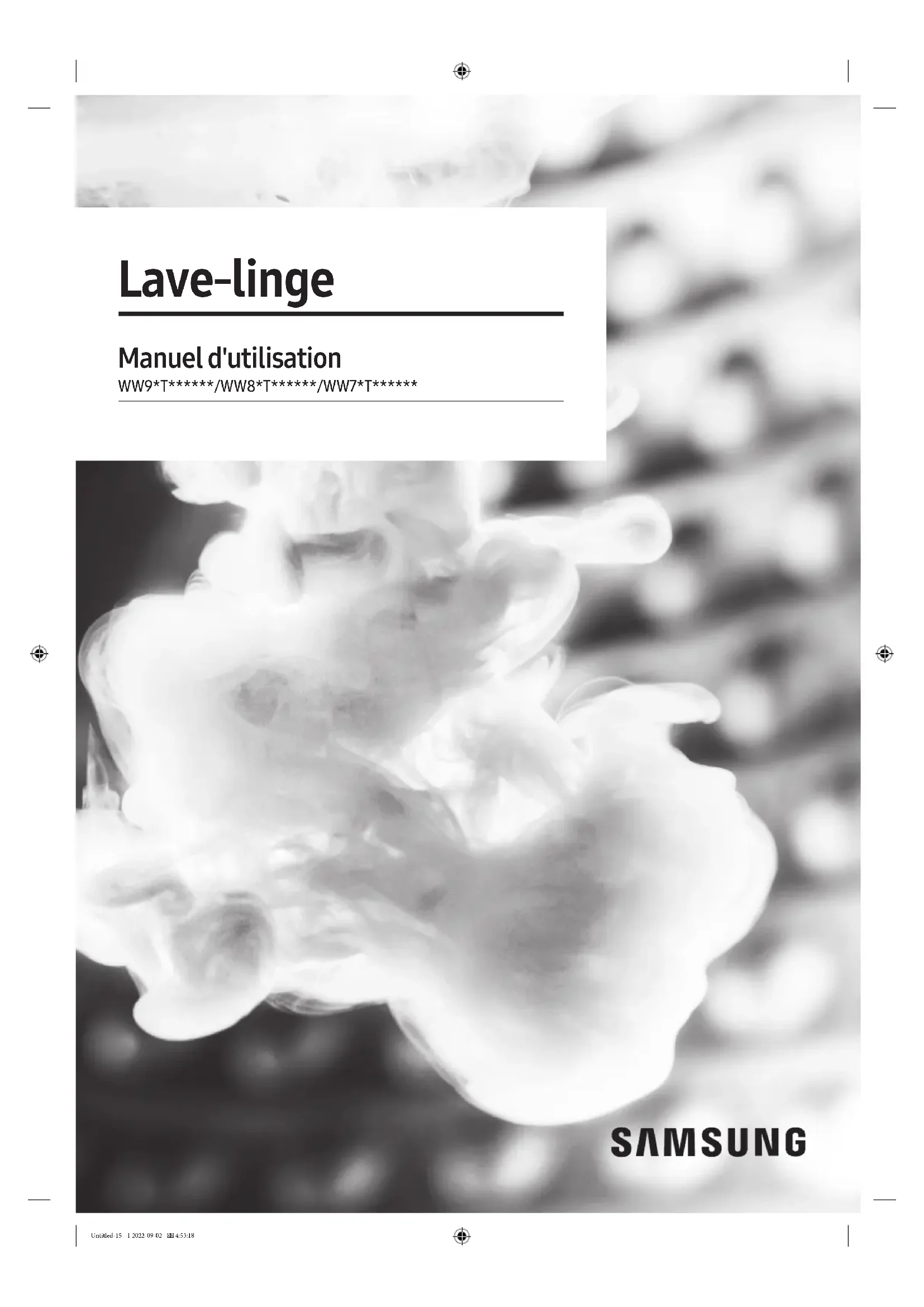 Lave-linge Manuel d'utilisation WW9*T******/WW8*T******/WW7*T****** Untitled-15 1 2022-09-02 4:53:18Français Français2 Sommaire Consignes de sécurité 4 Ce que vous devez savoir concernant les consignes de sécurité 4 Symboles de sécurité importants 4 Consignes de sécurité importantes 5 Avertissements importants concernant l'installation 6 Mises en garde concernant l'installation 8 Avertissements importants concernant l'utilisation 8 Mises en garde concernant l'utilisation 9 Avertissements importants concernant le nettoyage 12 Instructions concernant les déchets DEEE 13 Installation 14 Ce qui est inclus 14 Conditions d'installation 16 Installation étape par étape 18 Avant de démarrer 28 Configuration initiale 28 Instructions de lavage 29 Recommandation en matière de lessive 32 Instructions relatives au tiroir à lessive 33 Opérations 37 Panneau de commande 37 Lancement d'un cycle 39 Présentation des cycles 40 Fonctions supplémentaires 43 Fonctions système 46 Fonctions spéciales 48 SmartThings 51 Déclaration de logiciel open source 52 Untitled-15 2 2022-09-02 4:53:18Français Français 3 Maintenance 53 Nettoyage tambour+ 53 Vidange d'urgence 54 Nettoyage 55 Dégel de votre lave-linge 60 Mesures en cas de non-utilisation prolongée 60 Dépannage 61 Contrôles 61 Codes d'information 66 Caractéristiques techniques 69 Tableau des symboles d'entretien des tissus 69 Protection de l'environnement 70 Garantie pour les pièces détachées 71 Fiche de caractéristiques techniques 71 Coordonnées de contact 77