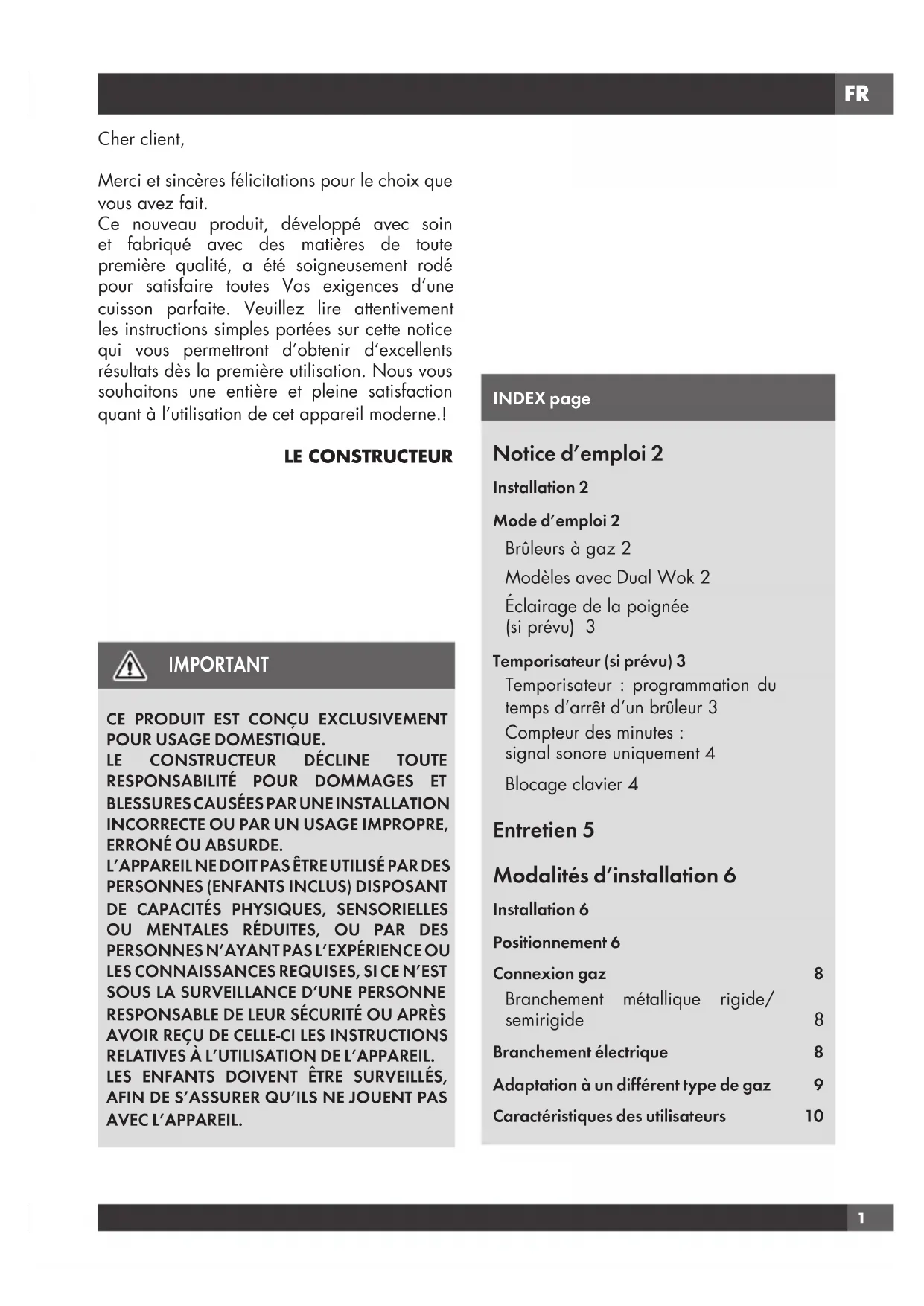 RESPONSABLE DE LEUR SÉCURITÉ OU APRÈS AVOIR REÇU DE CELLE-CI LES INSTRUCTIONS RELATIVES À L’UTILISATION DE L’APPAREIL. LES ENFANTS DOIVENT ÊTRE SURVEILLÉS, AFIN DE S’ASSURER QU’ILS NE JOUENT PAS AVEC L’APPAREIL. INDEX page Notice d’emploi 2 Installation 2 Mode d’emploi 2 Brûleurs à gaz 2 Modèles avec Dual Wok 2 Éclairage de la poignée (si prévu) 3 Temporisateur (si prévu) 3 Temporisateur : programmation du temps d’arrêt d’un brûleur 3 Compteur des minutes : signal sonore uniquement 4 Blocage clavier 4 Entretien 5 Modalités d’installation 6 Installation 6 Positionnement 6 Connexion gaz 8 Branchement métallique rigide/ semirigide 8 Branchement électrique 8 Adaptation à un différent type de gaz 9 Caractéristiques des utilisateurs 10FR