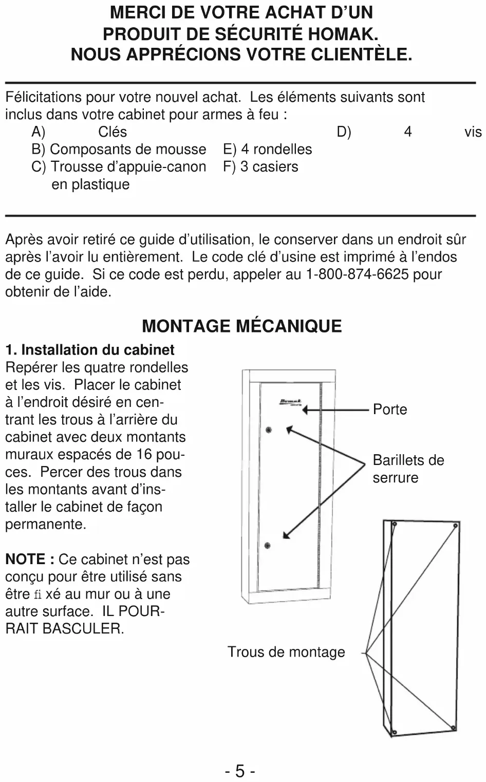PRODUIT DE SÉCURITÉ HOMAK. NOUS APPRÉCIONS VOTRE CLIENTÈLE. Après avoir retiré ce guide d’utilisation, le conserver dans un endroit sûr après l’avoir lu entièrement. Le code clé d’usine est imprimé à l’endos de ce guide. Si ce code est perdu, appeler au 1-800-874-6625 pour obtenir de l’aide. Félicitations pour votre nouvel achat. Les éléments suivants sont inclus dans votre cabinet pour armes à feu : A) Clés D) 4 vis B) Composants de mousse E) 4 rondelles C) Trousse d’appuie-canon F) 3 casiers en plastique Porte Barillets de serrure