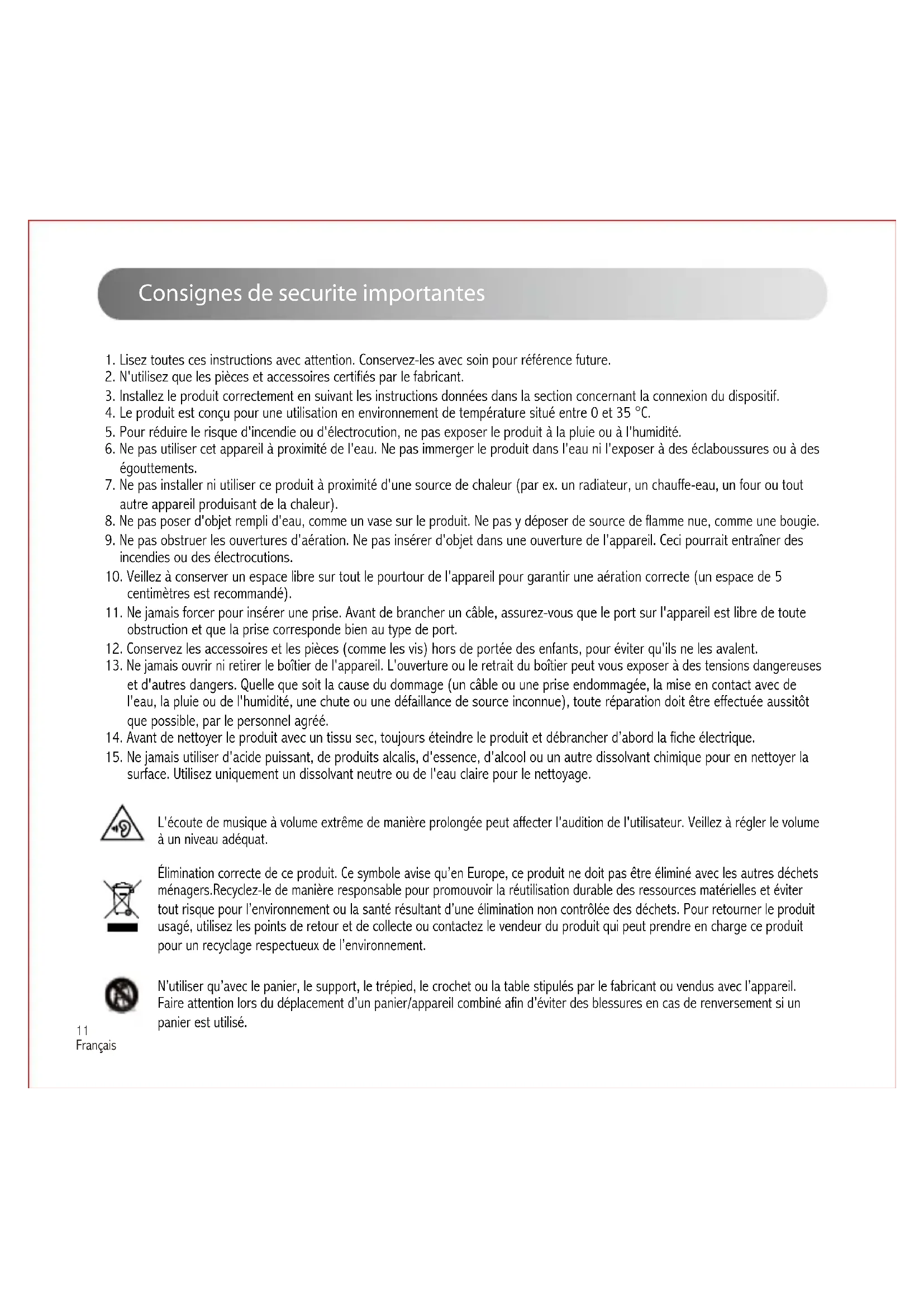 Français L'écoute de musique à volume extrême de manière prolongée peut affecter l'audition de l'utilisateur. Veillez à régler le volume à un niveau adéquat. Élimination correcte de ce produit. Ce symbole avise qu’en Europe, ce produit ne doit pas être éliminé avec les autres déchets ménagers.Recyclez-le de manière responsable pour promouvoir la réutilisation durable des ressources matérielles et éviter tout risque pour l’environnement ou la santé résultant d’une élimination non contrôlée des déchets. Pour retourner le produit usagé, utilisez les points de retour et de collecte ou contactez le vendeur du produit qui peut prendre en charge ce produit pour un recyclage respectueux de l’environnement. N’utiliser qu’avec le panier, le support, le trépied, le crochet ou la table stipulés par le fabricant ou vendus avec l’appareil. Faire attention lors du déplacement d’un panier/appareil combiné afin d’éviter des blessures en cas de renversement si un panier est utilisé.