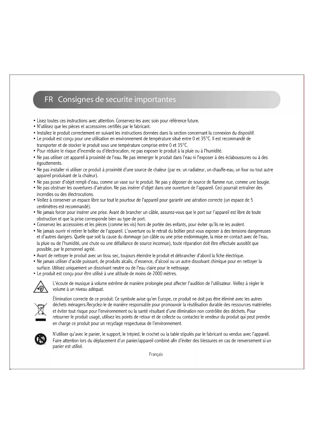 - Le produit est conçu pour être utilisé à une altitude de moins de 2000 mètres.Consignes de securite importantes Français Ce symbole indique à l'utilisateur la présence de voltage dangereux non isolé à l'intérieur de l'appareil, qui pourrait être suffisant pour constituer un risque d'électrocution. Ce symbole est présent pour indiquer que le produit ne doit pas être ouvert et qu'il ne contient aucun composant remplaçable par l'utilisateur. En cas de besoin de réparation, apportez le produit au centre de service agréé. Ce symbole indique que le produit doit être utilisé uniquement en intérieur. Ce symbole indique que le produit est de CLASSE II, autrement dit à double isolation électrique et qu'il ne nécessite donc pas de mise à la terre. Avertissement sur l'alimentation électrique: