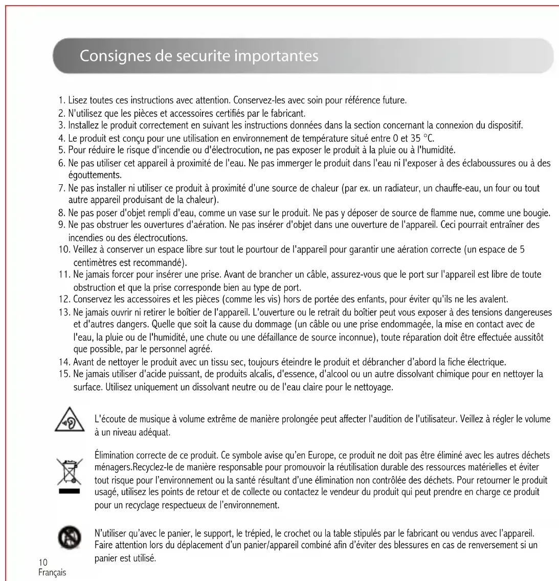 Français L'écoute de musique à volume extrême de manière prolongée peut affecter l'audition de l'utilisateur. Veillez à régler le volume à un niveau adéquat. Élimination correcte de ce produit. Ce symbole avise qu’en Europe, ce produit ne doit pas être éliminé avec les autres déchets ménagers.Recyclez-le de manière responsable pour promouvoir la réutilisation durable des ressources matérielles et éviter tout risque pour l’environnement ou la santé résultant d’une élimination non contrôlée des déchets. Pour retourner le produit usagé, utilisez les points de retour et de collecte ou contactez le vendeur du produit qui peut prendre en charge ce produit pour un recyclage respectueux de l’environnement. N’utiliser qu’avec le panier, le support, le trépied, le crochet ou la table stipulés par le fabricant ou vendus avec l’appareil. Faire attention lors du déplacement d’un panier/appareil combiné afin d’éviter des blessures en cas de renversement si un panier est utilisé.