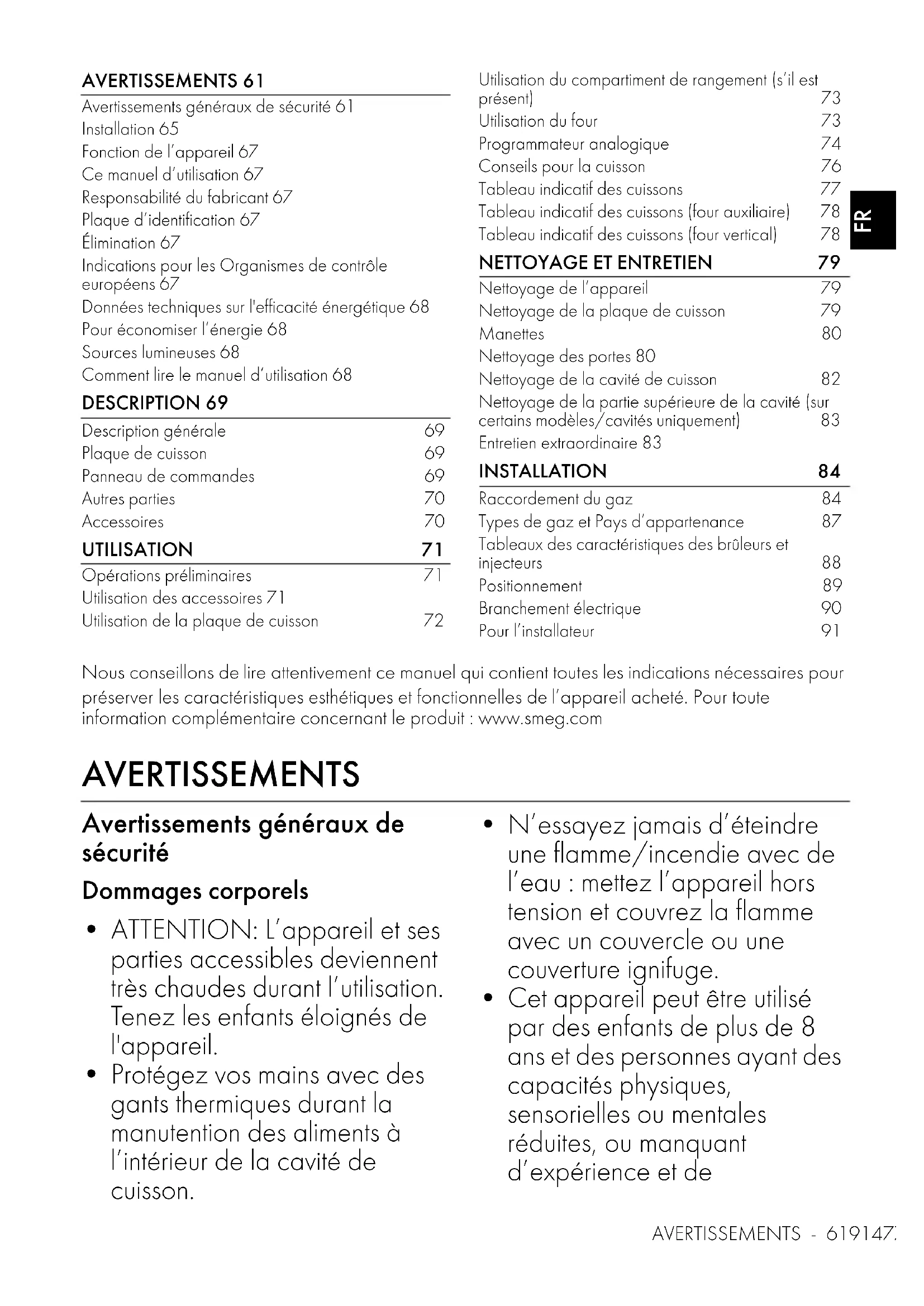 Nettoyage de l’appareil 79Nettoyage de la plaque de cuisson 79Manettes 80Nettoyage des portes 80Nettoyage de la cavité de cuisson 82Nettoyage de la partie supérieure de la cavité (sur certains modèles/cavités uniquement) 83Entretien extraordinaire 83 INSTALLATION 84 Raccordement du gaz 84Types de gaz et Pays d’appartenance 87Tableaux des caractéristiques des brûleurs et injecteurs 88Positionnement 89Branchement électrique 90Pour l’installateur 91 Nous conseillons de lire attentivement ce manuel qui contient toutes les indications nécessaires pour préserver les caractéristiques esthétiques et fonctionnelles de l’appareil acheté. Pour toute information complémentaire concernant le produit : www.smeg.com AVERTISSEMENTS Avertissements généraux de sécurité Dommages corporels