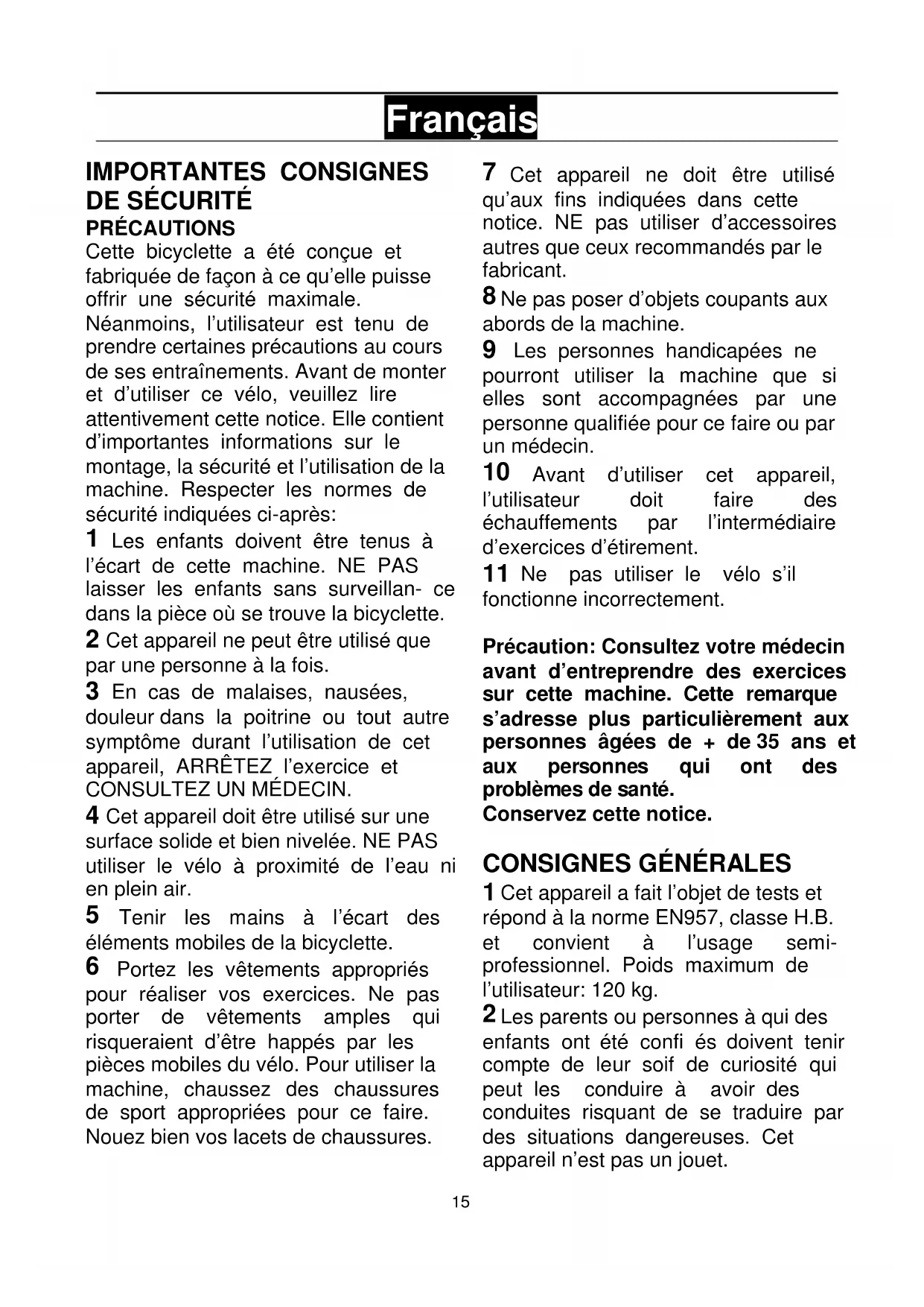 PRÉCAUTIONS Cette bicyclette a été conçue et fabriquée de façon à ce qu’elle puisse offrir une sécurité maximale. Néanmoins, l’utilisateur est tenu de prendre certaines précautions au cours de ses entraînements. Avant de monter et d’utiliser ce vélo, veuillez lire attentivement cette notice. Elle contient d’importantes informations sur le montage, la sécurité et l’utilisation de la machine. Respecter les normes de sécurité indiquées ci-après: