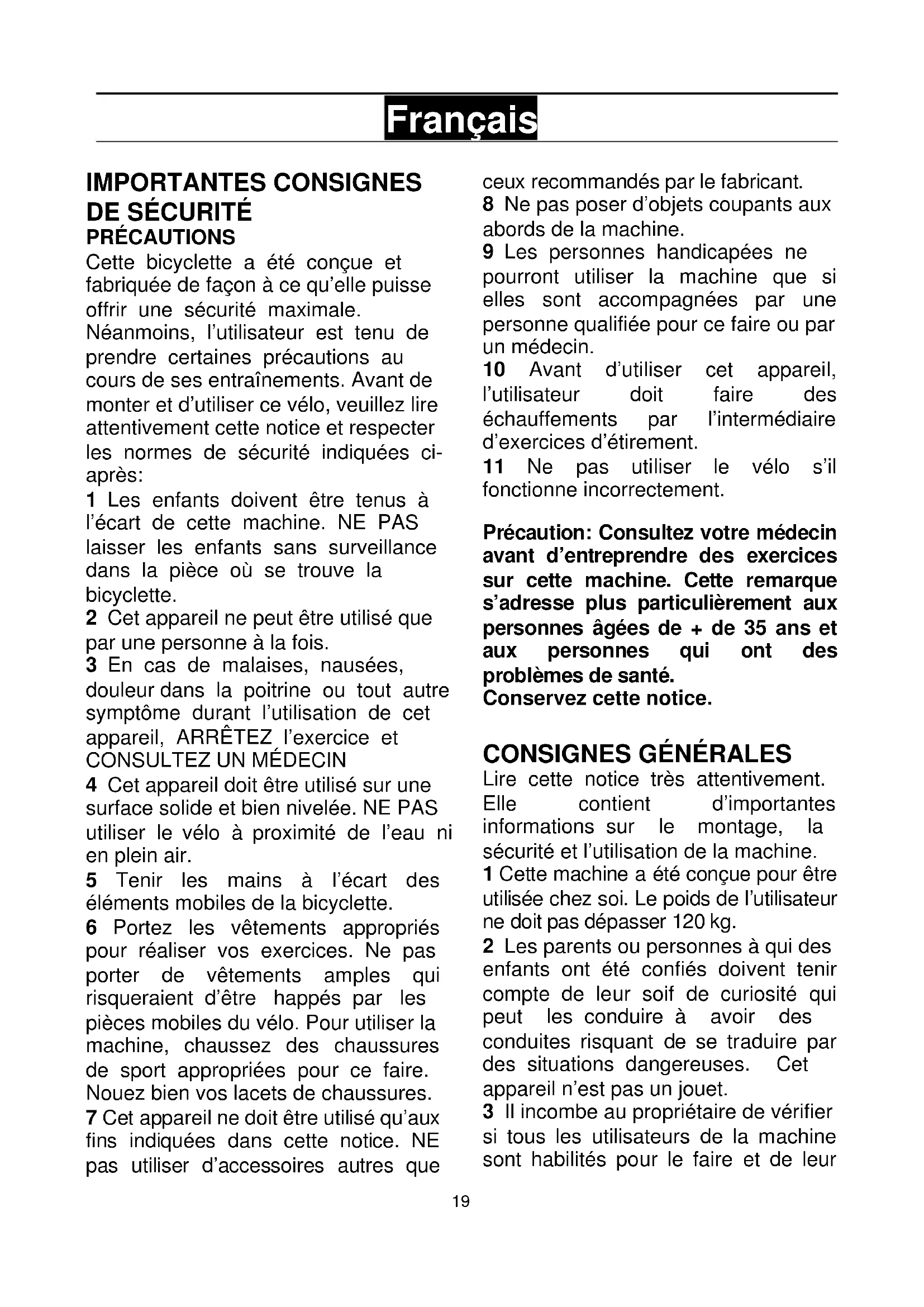 PRÉCAUTIONS Cette bicyclette a été conçue et fabriquée de façon à ce qu’elle puisse offrir une sécurité maximale. Néanmoins, l’utilisateur est tenu de prendre certaines précautions au cours de ses entraînements. Avant de monter et d’utiliser ce vélo, veuillez lire attentivement cette notice et respecter les normes de sécurité indiquées ci- après: 1 Les enfants doivent être tenus à l’écart de cette machine. NE PAS laisser les enfants sans surveillance dans la pièce où se trouve la bicyclette. 2 Cet appareil ne peut être utilisé que par une personne à la fois. 3 En cas de malaises, nausées, douleur dans la poitrine ou tout autre symptôme durant l’utilisation de cet appareil, ARRÊTEZ l’exercice et