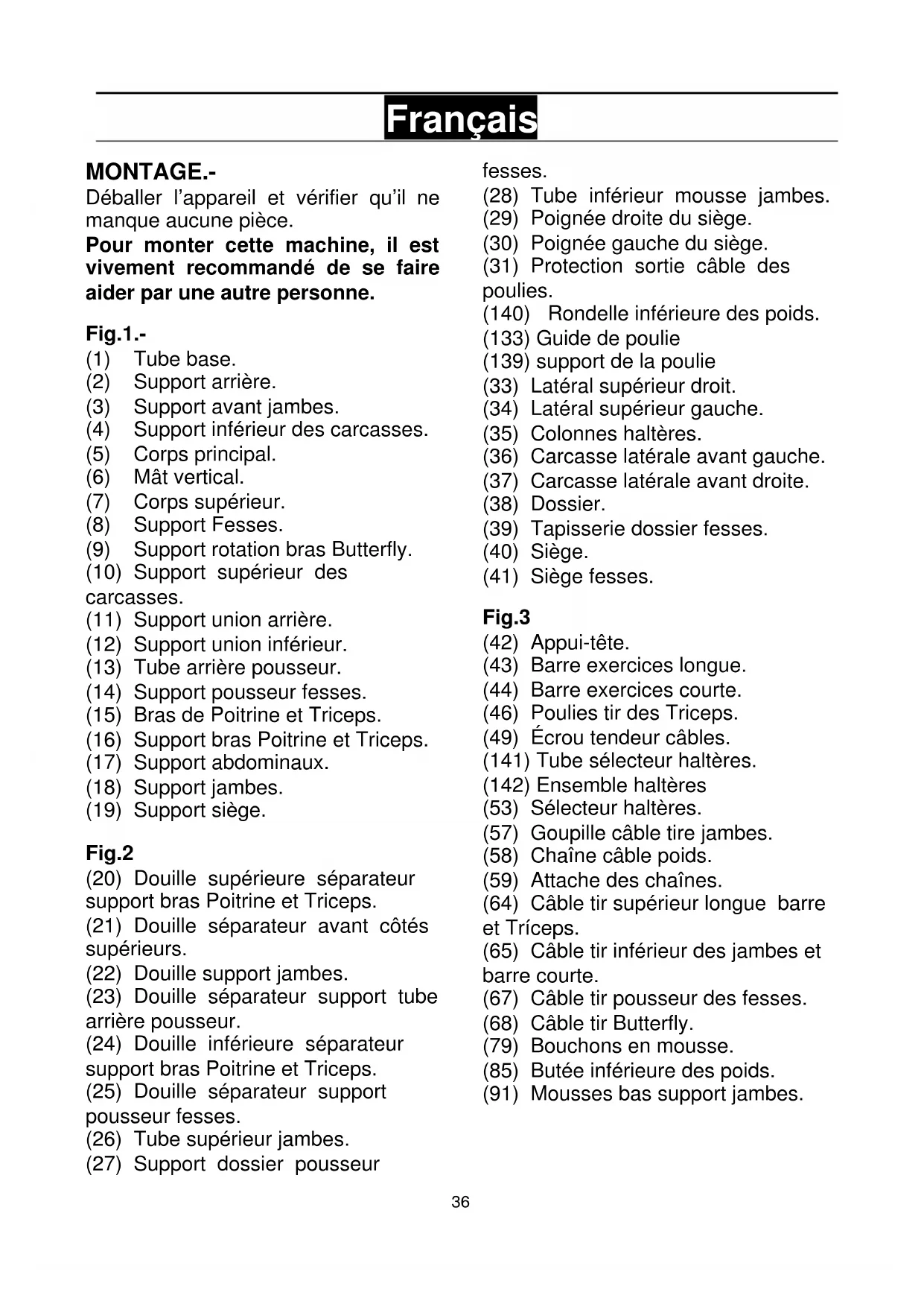 Français MONTAGE.- Déballer l’appareil et vérifier qu’il ne manque aucune pièce. Pour monter cette machine, il est vivement recommandé de se faire aider par une autre personne. Fig.1.- (1) Tube base. (2) Support arrière. (3) Support avant jambes. (4) Support inférieur des carcasses. (5) Corps principal. (6) Mât vertical. (7) Corps supérieur. (8) Support Fesses. (9) Support rotation bras Butterfly. (10) Support supérieur des carcasses. (11) Support union arrière. (12) Support union inférieur. (13) Tube arrière pousseur. (14) Support pousseur fesses. (15) Bras de Poitrine et Triceps. (16) Support bras Poitrine et Triceps. (17) Support abdominaux. (18) Support jambes. (19) Support siège. Fig.2 (20) Douille supérieure séparateur support bras Poitrine et Triceps. (21) Douille séparateur avant côtés supérieurs. (22) Douille support jambes. (23) Douille séparateur support tube arrière pousseur. (24) Douille inférieure séparateur support bras Poitrine et Triceps. (25) Douille séparateur support pousseur fesses. (26) Tube supérieur jambes. (27) Support dossier pousseur fesses. (28) Tube inférieur mousse jambes. (29) Poignée droite du siège. (30) Poignée gauche du siège. (31) Protection sortie câble des poulies. (140) Rondelle inférieure des poids. (133) Guide de poulie (139) support de la poulie (33) Latéral supérieur droit. (34) Latéral supérieur gauche. (35) Colonnes haltères. (36) Carcasse latérale avant gauche. (37) Carcasse latérale avant droite. (38) Dossier. (39) Tapisserie dossier fesses. (40) Siège. (41) Siège fesses. Fig.3 (42) Appui-tête. (43) Barre exercices longue. (44) Barre exercices courte. (46) Poulies tir des Triceps. (49) Écrou tendeur câbles. (141) Tube sélecteur haltères. (142) Ensemble haltères (53) Sélecteur haltères. (57) Goupille câble tire jambes. (58) Chaîne câble poids. (59) Attache des chaînes. (64) Câble tir supérieur longue barre et Tríceps. (65) Câble tir inférieur des jambes et barre courte. (67) Câble tir pousseur des fesses. (68) Câble tir Butterfly. (79) Bouchons en mousse. (85) Butée inférieure des poids. (91) Mousses bas support jambes.37