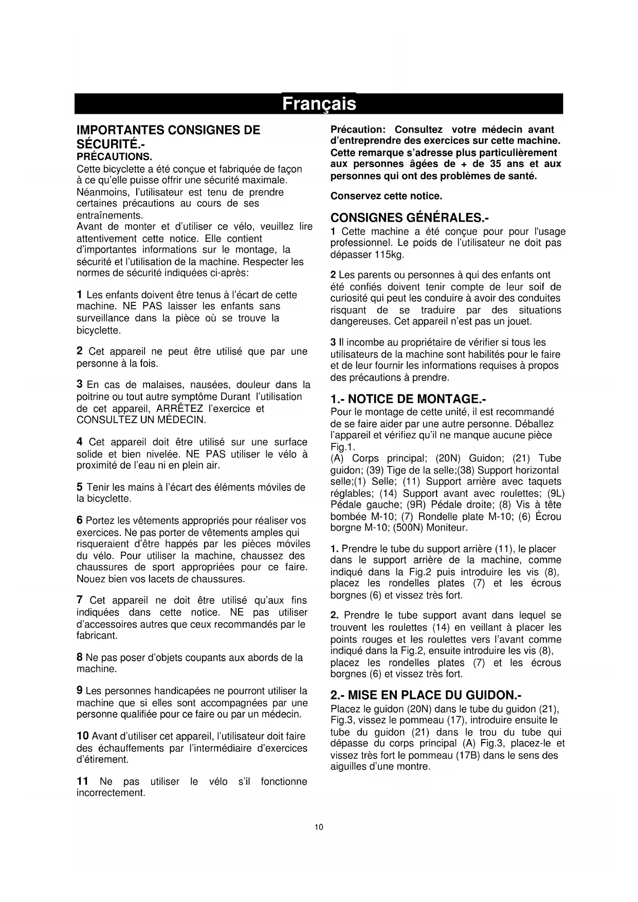 SÉCURITÉ.- PRÉCAUTIONS. Cette bicyclette a été conçue et fabriquée de façon à ce qu’elle puisse offrir une sécurité maximale. Néanmoins, l’utilisateur est tenu de prendre certaines précautions au cours de ses entraînements. Avant de monter et d’utiliser ce vélo, veuillez lire attentivement cette notice. Elle contient d’importantes informations sur le montage, la sécurité et l’utilisation de la machine. Respecter les normes de sécurité indiquées ci-après: