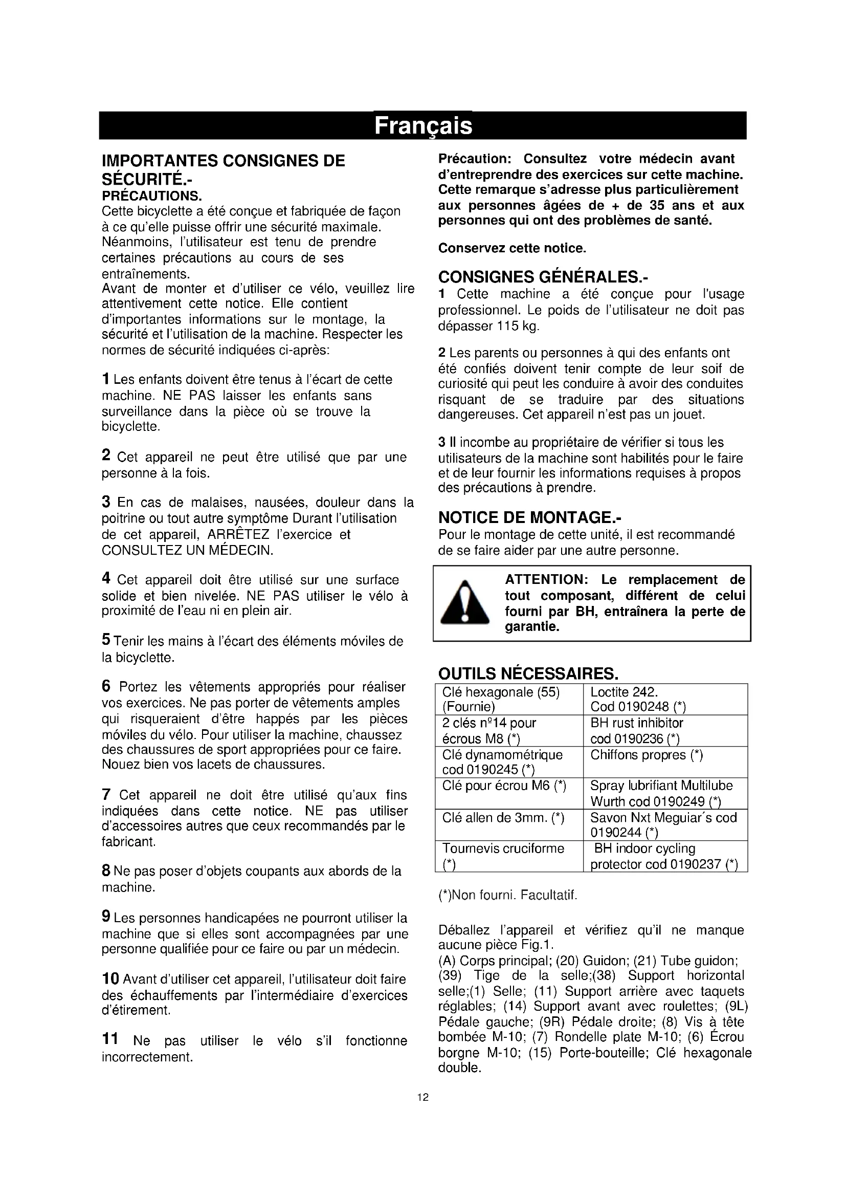 SÉCURITÉ.- PRÉCAUTIONS. Cette bicyclette a été conçue et fabriquée de façon à ce qu’elle puisse offrir une sécurité maximale. Néanmoins, l’utilisateur est tenu de prendre certaines précautions au cours de ses entraînements. Avant de monter et d’utiliser ce vélo, veuillez lire attentivement cette notice. Elle contient d’importantes informations sur le montage, la sécurité et l’utilisation de la machine. Respecter les normes de sécurité indiquées ci-après: