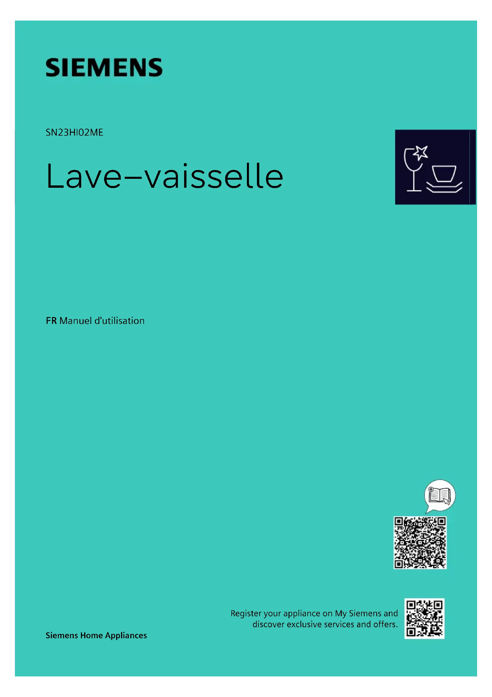 SN23HI02ME Lave–vaisselle FR Manuel d'utilisation Siemens Home Appliances Register your appliance on My Siemens and discover exclusive services and offers.fr Table des matières Vous pouvez trouver d'autres informations et explications en ligne. Scannez le code QR sur la page de titre. Table des matièresTable des matières 1 Sécurité ........................................ 3