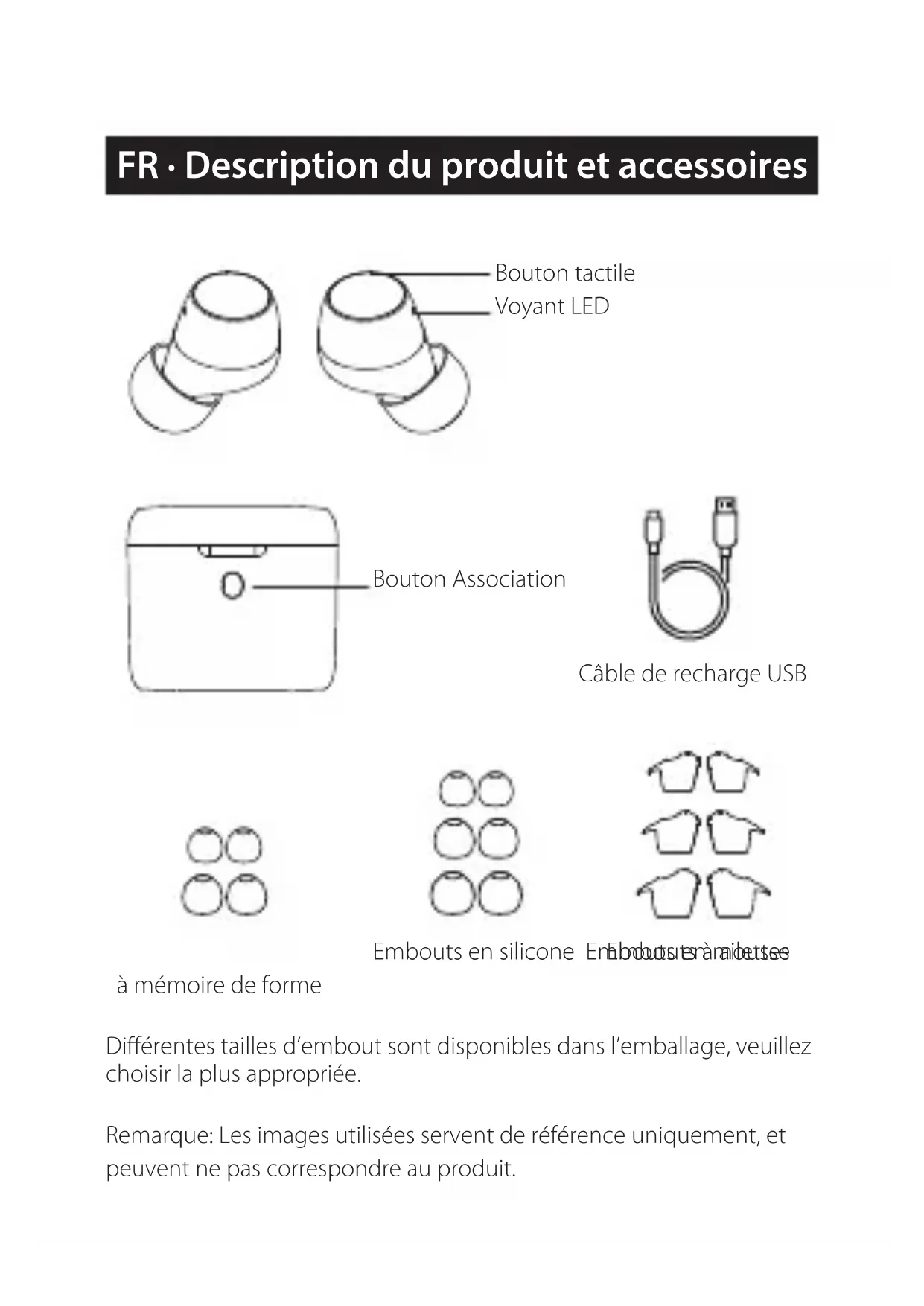 - Do not use sharp objects to scratch product surface to avoid damaging shell and affecting facade. ■ MaintenanceEdif ier International Limited P.O. Box 6264 General Post Off ice Hong Kong www.edif ier.com 2019 Edif ier International Limited. All rights reserved. Printed in China NOTICE: For the need of technical improvement and system upgrade, information contained herein may be subject to change from time to time without prior notice. Products of EDIFIER will be customized for different applications. Pictures and illustrations shown on this manual may be slightly different from actual product. Images are for illustrative purposes only and may differ from the actual product.Différentes tailles d’embout sont disponibles dans l’emballage, veuillez choisir la plus appropriée. Remarque: Les images utilisées servent de référence uniquement, et peuvent ne pas correspondre au produit. FR · Description du produit et accessoires Voyant LED Bouton tactile Câble de recharge USB Bouton Association Embouts en silicone Embouts en mousse à mémoire de forme Embouts à ailettes■ Instructions sur le port ● Comment porter les embouts à ailettes Orientez l’écouteur et l’embout à ailette dans la même direction Placez l’embout à ailette sur l’écouteur Pincez l’embout à mémoire de forme et placez-le sur l’écouteur Placez l’embout dans l’oreille et relâchez. La mousse à mémoire de forme se dilate de nouveau Placez l’embout sur l’écouteur ● Comment porter les embouts en mousse à mémoire de forme■ Mode d’emploi Entrée nominale: 5V 55mA(écouteur) 5V 500mA(étui-chargeur) ● Charger les écouteurs
