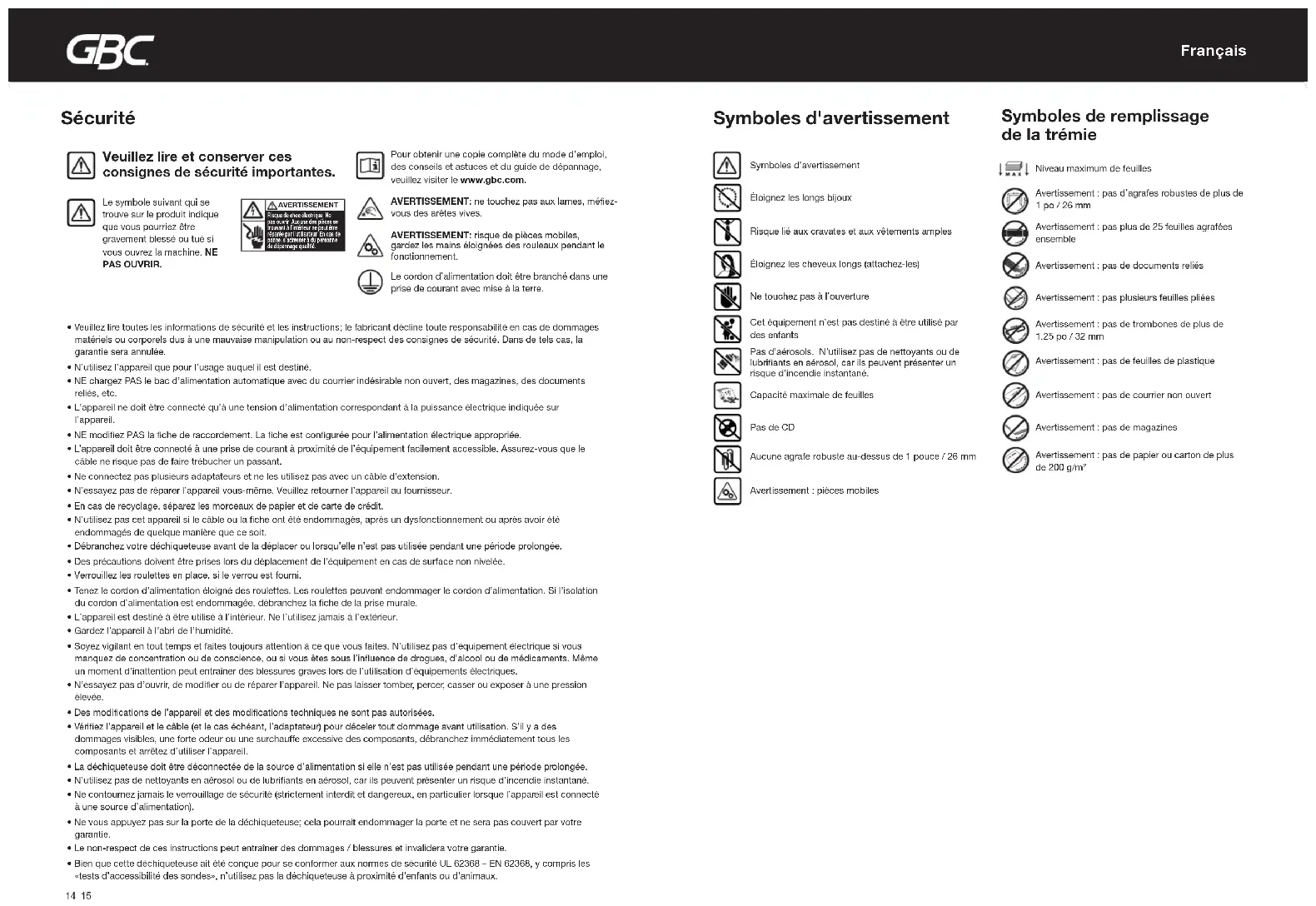 Français Sécurité Pour obtenir une copie complète du mode d’emploi, des conseils et astuces et du guide de dépannage, Veuillez lire et conserver ces consignes de sécurité importantes. veuillez visiter le www.gbc.com. AVERTISSEMENT Risque de choc électrique Ne pas ouvrir Aucune des pièces se trouvant à l’intérieur ne peut être réparée par l’utilisateur En cas de panne, s’adresser à du personnede dépannage qualié.
