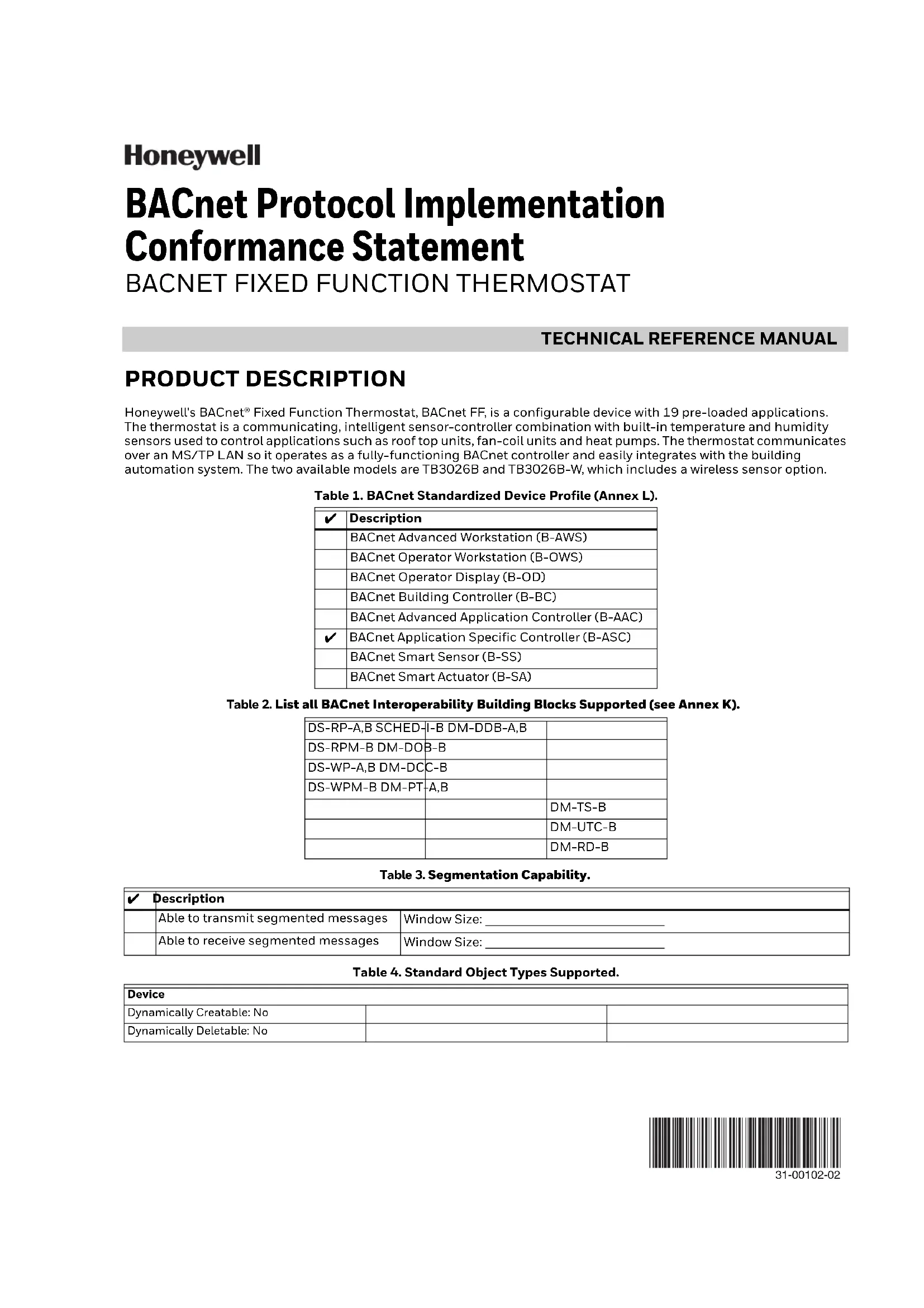 Retrouvez gratuitement la notice de l'appareil BACnet TB3026B HONEYWELL au format PDF.