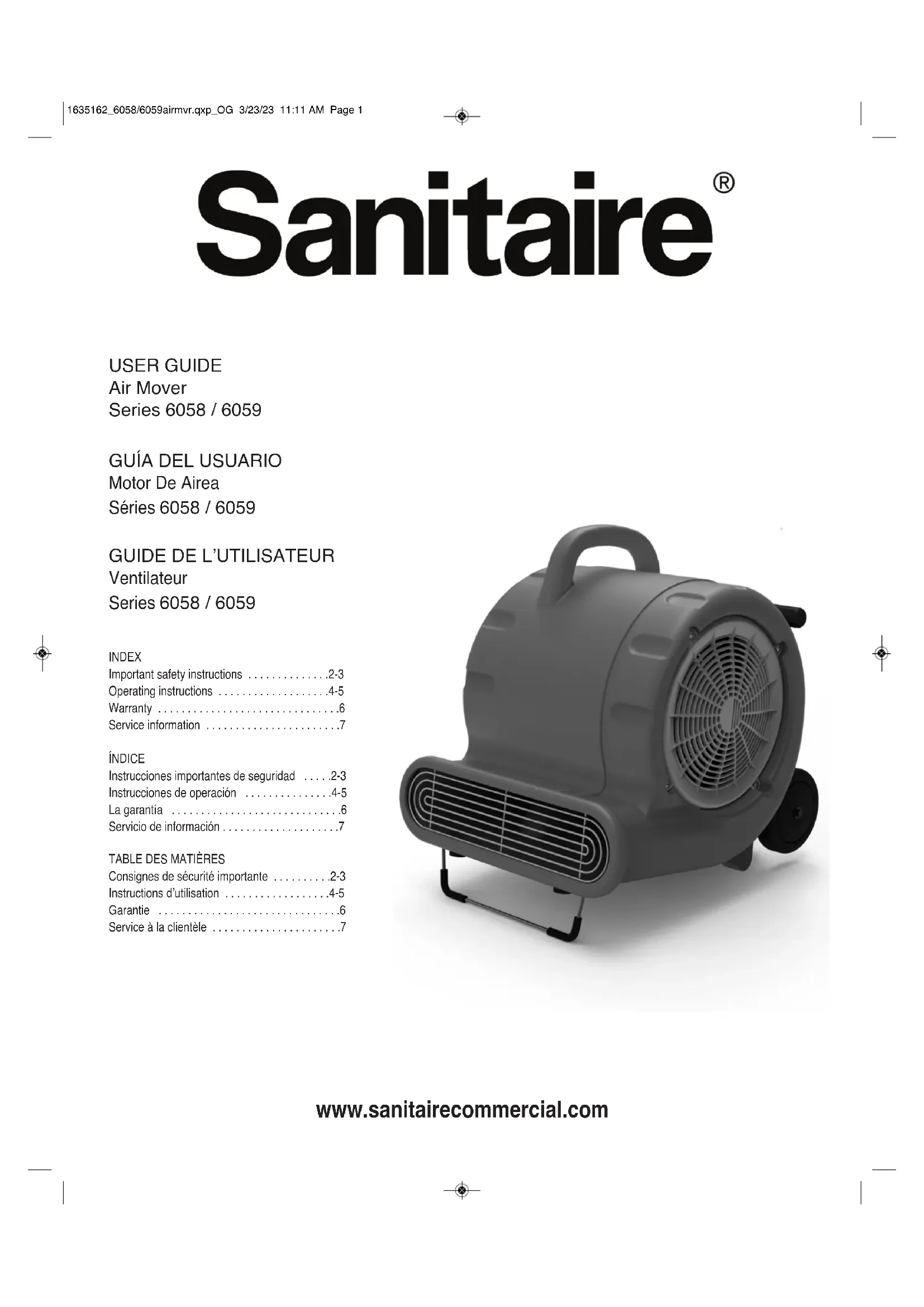 Assurez-vous que le ventilateur est dans un endroit sécuritaire pour ’utilisation. Ne placez pas l’appareil dans une flaque d’eau et assurez-vousqu’il est protégé des gouttes et des éclaboussures d’eau.Branchez le cordon d’alimentation dans une prise de courant mise à laterre. Sortez toujours le cordon d’alimentation complètement avant d’utiliser ’appareil. Inspectez le cordon d’alimentation pour voir s’il est endommagéavant de l’utiliser. Remplacez immédiatement le cordon s’il est endommagé.Placez l’appareil dans la position où vous souhaitez l’utiliserÀ l’horizontale – pour faire sécher les planchers et les tapis (Fig. 1)Incliné – finition de plancher, peinture, etc. (Fig. 2) la verticale – pour faire sécher le mur et le plafond (Fig. 3)Réglez la vitesse désirée en tournant l’interrupteurVérifiez si l’appareil fonctionne de manière appropriée. Ne transportez pasou ne déplacez pas l’appareil lorsque vous l’utilisez.Pour arrêter l’appareil, mettez l’interrupteur à la position ARRÊT.La machine est équipée d’un capteur thermique d’arrêt automatique lors desurcharge pour protéger le moteur des surchauffes. Si le capteur thermiqued’arrêt automatique lors de surcharge s’enclenche, il sera réinitialiséautomatiquement lorsque le moteur sera refroidi suffisamment,habituellement après 15 à 30 minutes.COMPOSANTES DE L’APPAREIL (Fig. 5) A. Interrupteur à 3 vitesses D. Sortie d’air B. Poignée de transport E. Entrée d’air C. Rangement du cordon d’alimentation F. Béquille de support ENTRETIEN DE L’APPAREILEffectuez simplement les procédures d’entretien suivantes pour garderl’appareil en bonne condition de fonctionnement.AVERTISSEMENT : Débranchez le cordon de la prise lorsque vous nel’utilisez pas ou avant tout entretien.• Inspectez le cordon d’alimentation pour voir s’il est endommagé aprèschaque utilisation. Remplacez immédiatement le cordon d’alimentation s’ilest endommagé.• Nettoyez la machine avec un linge humide.• Vérifiez pour détecter l’accumulation de poussière autour de l’entrée d’airet des sorties d’air et nettoyez celles-ci le cas échéant. Des sorties ou desentrées d’air obstruées pourraient faire surchauffer le moteur et entraînerune défaillance prématurée. Les réclamations sous garantie pour ce typede dommage ne seront pas acceptées.Si l’appareil ne fonctionne pas :• Vérifiez les dommages au cordon d’alimentation.• Vérifiez la connexion de la fiche d’alimentation.• Vérifiez les disjoncteurs du bâtiment.• Capteur thermique d’arrêt automatique – attendez 15 à 30 minutes.• Communiquez avec le centre de service.RANGEMENT ET TRANSPORT DU VENTILATEUREntourez bien le cordon d’alimentation (Fig.4) et rangez l’appareil dans unendroit frais et sec. N’exposez pas l’appareil à la pluie, rangez-le àl’intérieur. Empilez les appareils comme illustré pour le rangement (Fig. 6)ATTENTION : N’empilez pas plus de tres unités. N’empilez pas lesappareils pendant le transport et fixez-les avec une courroie.La poignée télescopique et les roues sont incluses avec le SC6059Pour les utiliser, appuyez sur le bouton de déclenchement et tirez sur lapoignée jusqu’à ce qu’elle se verrouille en place. Inclinez l’appareil sur lesroues et déplacez-le sur les roulettes à l’emplacement désiré. 1635162_6058/6059airmvr.qxp_OG 3/23/23 11:11 AM Page 56 ENGLISH WARRANTY This warranty gives you specific legal rights,and you may also have other rights which may ary from state to state. If you need additionalinstruction regarding this warranty or havequestions regarding what it may cover, pleasecontact Sanitaire Customer Service by E-mail,telephone or regular mail as described below. Limited one-year warranty Subject to the *EXCEPTIONS ANDEXCLUSIONS identified below, upon receipt ofthe product Sanitaire will repair or replace (with ew, refurbished, lightly used, orremanufactured components or products), at Sanitaire's option, free of charge from thedate of purchase by the original purchaser, forone year any defective or malfunctioning part.See information below on "If your Sanitaireproduct should require service".This warranty does not apply to fans or routinemaintenance components such as filters, beltsor brushes. Damage or malfunction caused bynegligence, abuse, neglect, unauthorizedrepair, or any other use not in accordance withthe user guide is not covered. Some states do not allow the exclusion orlimitation of incidental or conse quentialdamages, so the above limitation orexclusion may not apply to you. *EXCEPTIONS AND EXCLUSIONS FROMTHE TERMS OF THE LIMITED WARRANTYTHIS WARRANTY IS EXCLUSIVE AND INLIEU OF ANY OTHER WARRANTIES, EITHERORAL OR WRITTEN. ANY IMPLIEDWARRANTIES WHICH MAY ARISE BYOPERATION OF LAW, INCLUDING THEIMPLIED WARRANTIES OFMERCHANTABILITY AND FITNESS FOR APARTICULAR PURPOSE, ARE LIMITED TOTHE ONE-YEAR DURATION FROM THEDATE OF PURCHASE AS DESCRIBEDABOVE.Some states do not allow limitations on howlong an implied warranty last so the abovelimitation may not apply to you. NOTE: Please keep your original sales receipt. It provides proof of date of purchase in the event of a warranty claim. ESPAÑOL GARANTÍA Esta garantía le concede derechos legalesespecíficos, y es posible que tenga otrosderechos que pueden variar de un estado aotro. Si necesita instrucciones adicionales conrespecto a esta garantía o si tiene preguntascon respecto a lo que puede cubrir,comuníquese con el departamento deatención al cliente de Sanitaire por correoelectrónico, teléfono o correo postal como sedescribe a continuación. Garantía limitada un año Sujeta a las *EXCEPCIONES YEXCLUSIONES identificadas a continuación,una vez que Sanitaire reciba el producto, y asu única discreción, Sanitaire reparará oreemplazará gratuitamente (con componenteso productos nuevos, remanufacturados,ligeramente usados o renovados) a op