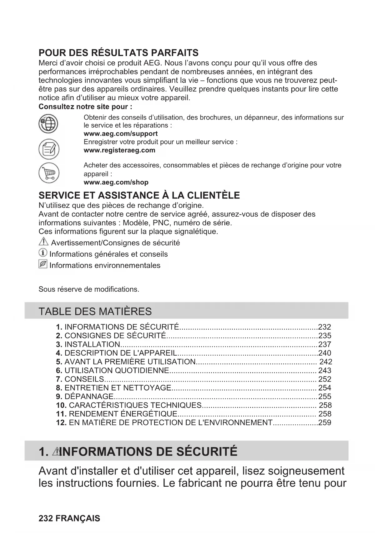 Merci d’avoir choisi ce produit AEG. Nous l’avons conçu pour qu’il vous offre desperformances irréprochables pendant de nombreuses années, en intégrant destechnologies innovantes vous simplifiant la vie – fonctions que vous ne trouverez peut-être pas sur des appareils ordinaires. Veuillez prendre quelques instants pour lire cettenotice afin d’utiliser au mieux votre appareil.Consultez notre site pour :Obtenir des conseils d’utilisation, des brochures, un dépanneur, des informations surle service et les réparations :www.aeg.com/supportEnregistrer votre produit pour un meilleur service :www.registeraeg.comAcheter des accessoires, consommables et pièces de rechange d’origine pour votreappareil :www.aeg.com/shop