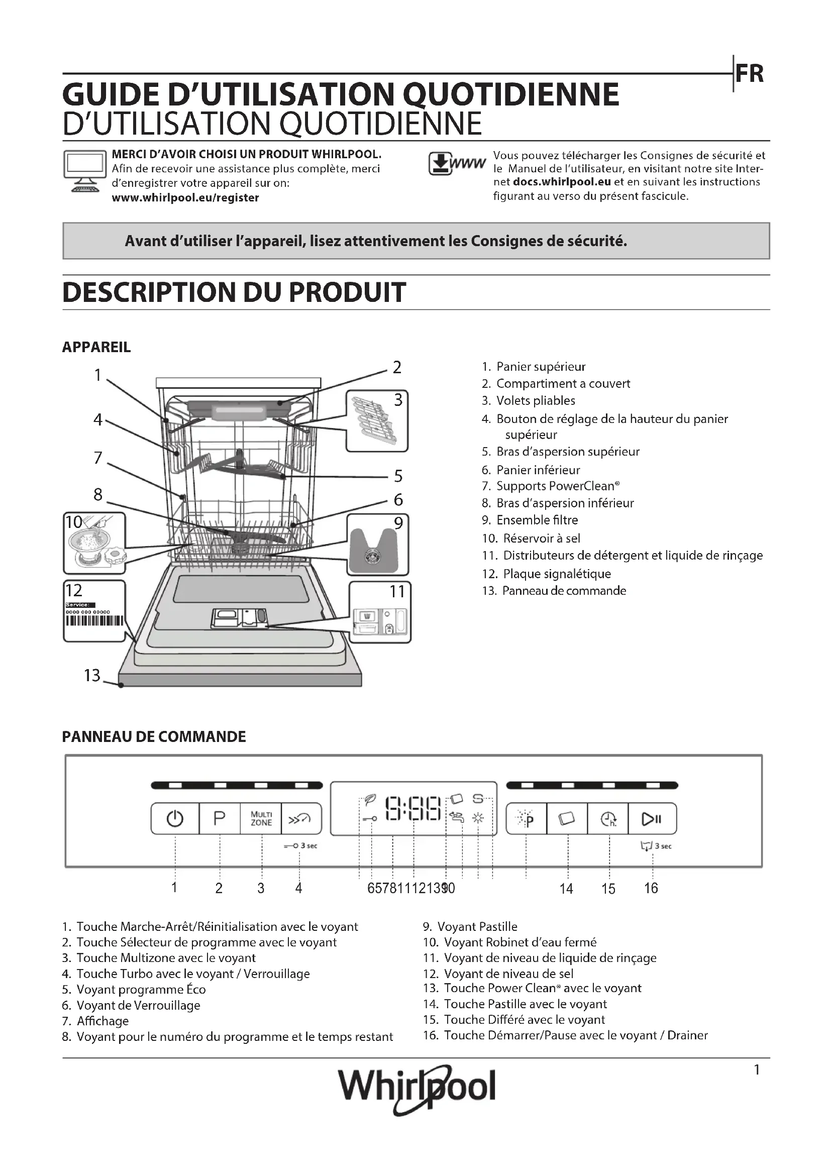 MERCI D’AVOIR CHOISI UN PRODUIT WHIRLPOOL. Afin de recevoir une assistance plus complète, merci d’enregistrer votre appareil sur on:www.whirlpool.eu/registerVous pouvez télécharger les Consignes de sécurité et le Manuel de l’utilisateur, en visitant notre site Inter-net docs.whirlpool.eu et en suivant les instructions figurant au verso du présent fascicule.