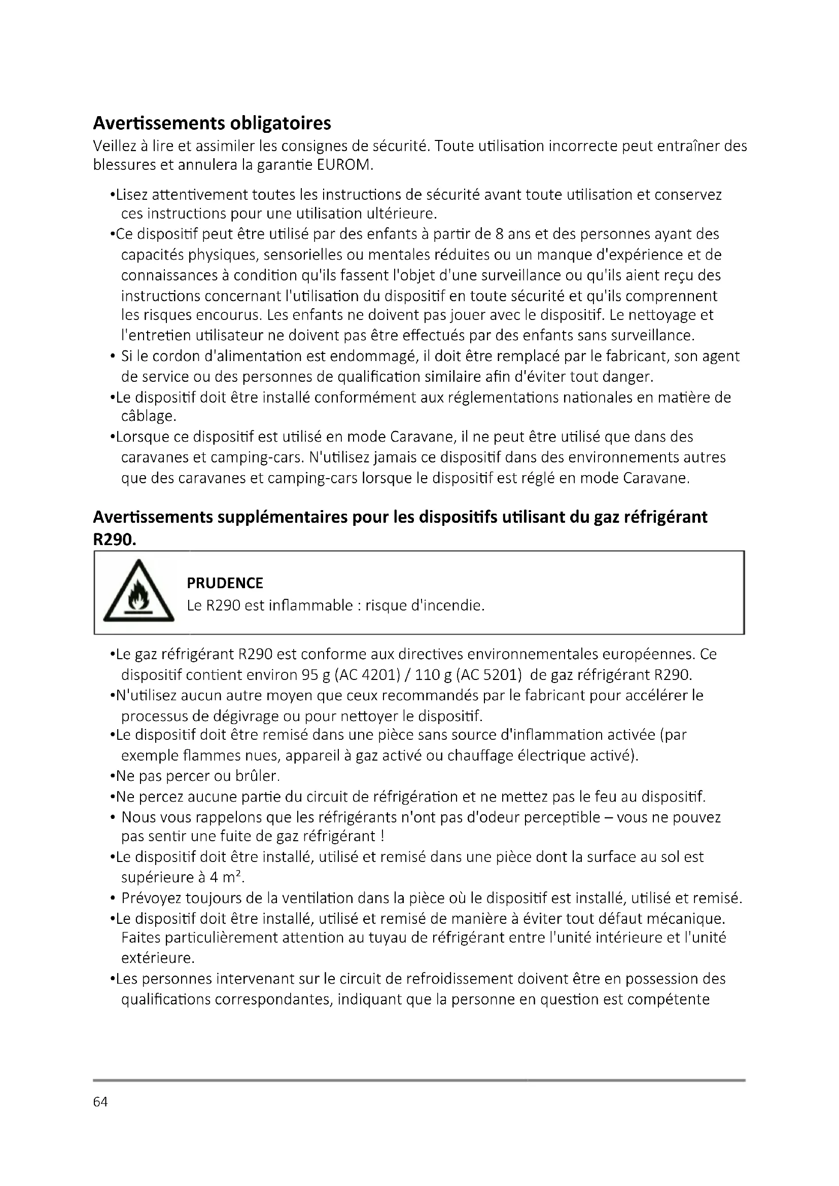 - Lorsque ce disposif est ulisé en mode Caravane, il ne peut être ulisé que dans des caravanes et camping-cars. N'ulisez jamais ce disposif dans des environnements autres que des caravanes et camping-cars lorsque le disposif est réglé en mode Caravane. Averssements supplémentaires pour les disposifs ulisant du gaz réfrigérant R290. PRUDENCE Le R290 est inammable: risque d'incendie.