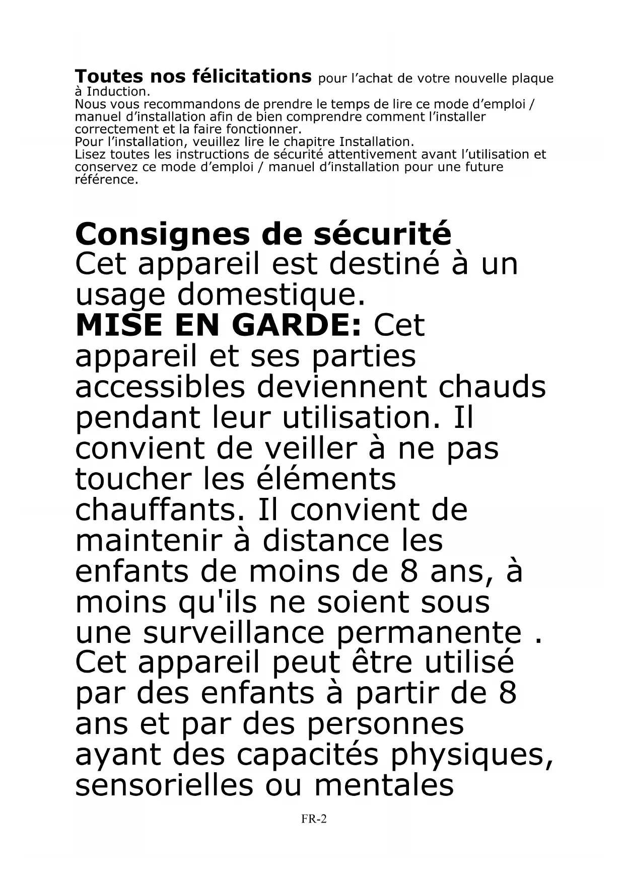 Table de cuisson induction Induktionskochfeld Inductie kookplaat Cocina de inducción Veuillez lire attentivement les instructions suivantes avant d’utiliser cet appareil. Veuillez conserver ces instructions pour toute future référence. Bitte lesen Sie die folgenden Anweisungen sorgfältig durch, bevor Sie das Gerät verwenden und bitte heben Sie sie zum späteren Nachschlagen auf. Lees eerst de volgende instructies zorgvuldig door om dit apparaat te gebruiken. Bewaar deze instructies voor toekomstig gebruik. Lea atentamente las siguientes instrucciones antes para utilizar este dispositivo. Guarde estas instrucciones para futuras consultas. Manuel d'instructions Bedienungsanleitung Handleiding Manual de instrucciones SCIH360B SCIH360BFR-2 Toutes nos félicitations pour l’achat de votre nouvelle plaque à Induction. Nous vous recommandons de prendre le temps de lire ce mode d’emploi / manuel d’installation afin de bien comprendre comment l’installer correctement et la faire fonctionner. Pour l’installation, veuillez lire le chapitre Installation. Lisez toutes les instructions de sécurité attentivement avant l’utilisation et conservez ce mode d’emploi / manuel d’installation pour une future référence. Consignes de sécurité Cet appareil est destiné à un usage domestique. MISE EN GARDE: Cet appareil et ses parties accessibles deviennent chauds pendant leur utilisation. Il convient de veiller à ne pas toucher les éléments chauffants. Il convient de maintenir à distance les enfants de moins de 8 ans, à moins qu'ils ne soient sous une surveillance permanente . Cet appareil peut être utilisé par des enfants à partir de 8 ans et par des personnes ayant des capacités physiques, sensorielles ou mentalesFR-3 réduites ou un manque d’expérience et de connaissances à condition qu’elles aient été placées sous surveillance ou qu'elles aient reçu des instructions concernant l’utilisation de l’appareil en toute sécurité et qu’elles comprennent les dangers encourus. Les enfants ne doivent pas jouer avec l’appareil. Le nettoyage et l’entretien par l’usager ne doivent pas être effectués par des enfants, sans surveillance. MISE EN GARDE: Laisser cuire des aliments sans surveillance sur une table de cuisson en utilisant des matières grasses ou de l'huile peut être dangereux et déclencher un incendie.FR-4