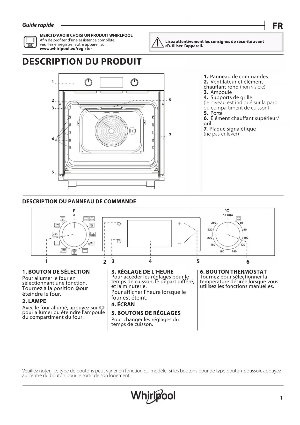 MERCI D’AVOIR CHOISI UN PRODUIT WHIRLPOOL Afin de profiter d’une assistance complète, veuillez enregistrer votre appareil sur www . whirlpool . eu/ register Lisez attentivement les consignes de sécurité avant d’utiliser l’appareil.