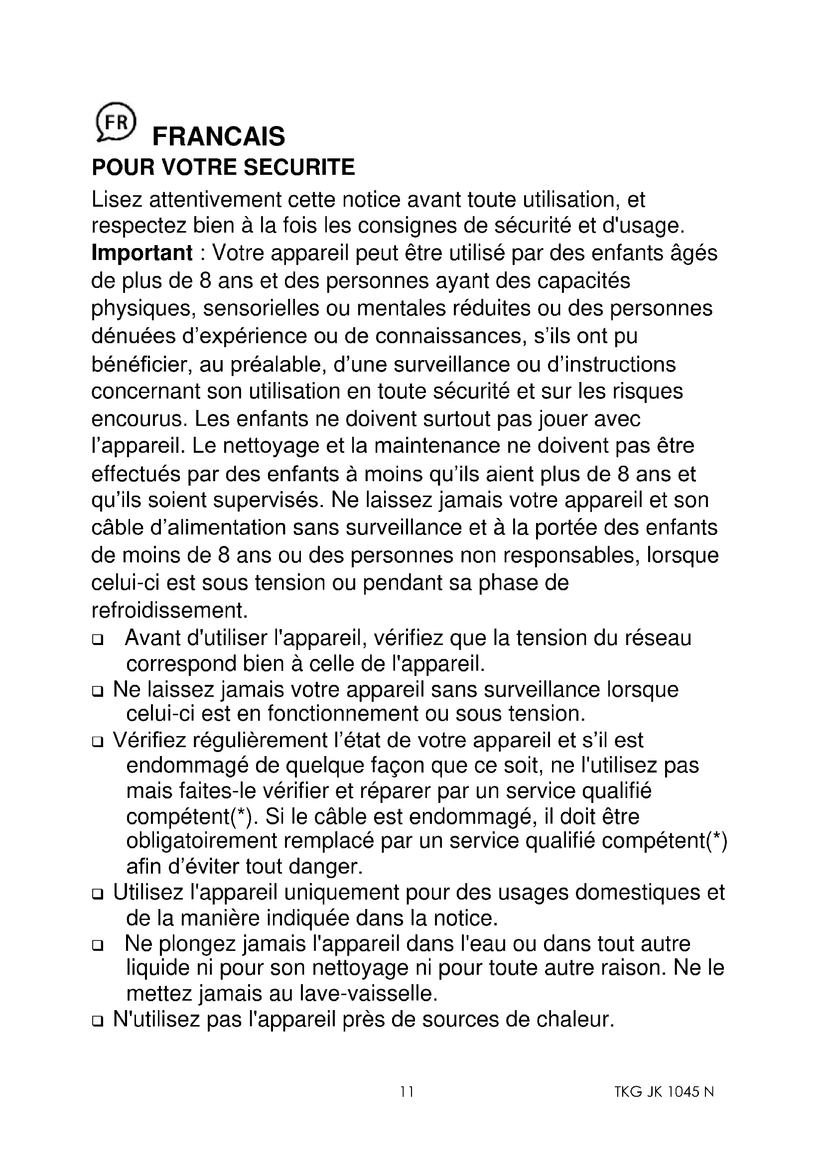 (*) Service qualifié compétent: service après-vente du fabricant ou de l'importateur ou une personne qualifiée, reconnue et habilitée à faire ce genre de réparation afin d'éviter tout danger. Dans tous les cas, veuillez retourner l'appareil auprès de ce service.TKG JK 1045 N