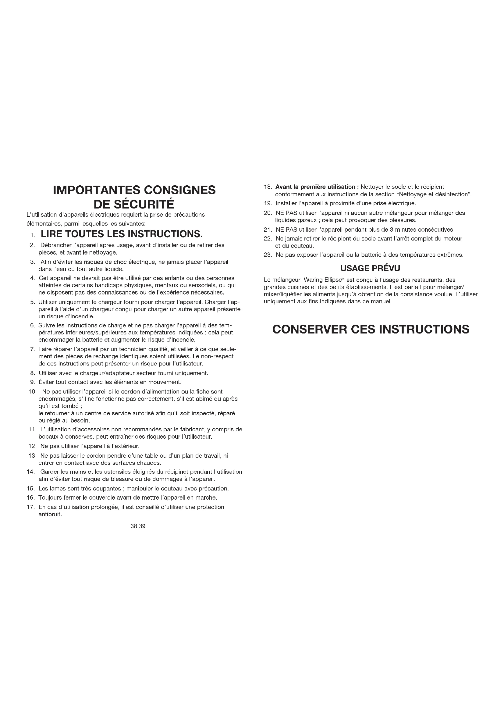 Cet appareil renferme deux batterieslithium-ion rechargeables et recyclables, qu’il convient de recycler en n de vie. Ne pas incinérer ou composter les batteries. Ne pas jeter les batterieslithium-ion avec les ordures ménagères; vérier les options de recyclage disponibles dans votreLieu de résidence auprès des autorités compétentes. Ne pas essayer de démonter le moteur du système de mélange Waring Ellipse