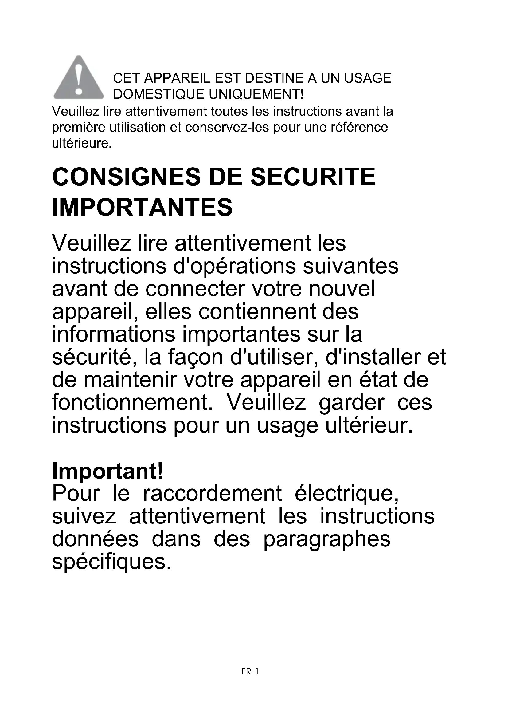 IMPORTANTES Veuillez lire attentivement les instructions d'opérations suivantes avant de connecter votre nouvel appareil, elles contiennent des informations importantes sur la sécurité, la façon d'utiliser, d'installer et de maintenir votre appareil en état de fonctionnement. Veuillez garder ces instructions pour un usage ultérieur. Important! Pour le raccordement électrique, suivez attentivement les instructions données dans des paragraphes spécifiques.FR-2