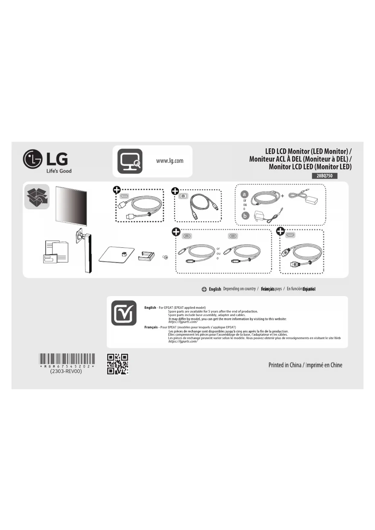 LED LCD Monitor (LED Monitor) / Moniteur ACL À DEL (Moniteur à DEL) / Monitor LCD LED (Monitor LED) www.lg.com Depending on country / Selon les pays / En función del país English - For EPEAT (EPEAT applied model)Spare parts are available for 5 years after the end of production.Spare parts include base assembly, adapter and cables. https://lgparts.com/ Français - Pour EPEAT (modèles pour lesquels s’applique EPEAT)Elles comprennent les pièces pour l’assemblage de la base, l’adaptateur et les câbles. Les pièces de rechange peuvent varier selon le modèle. Vous pouvez obtenir plus de renseignements en visitant le site Web https://lgparts.com/