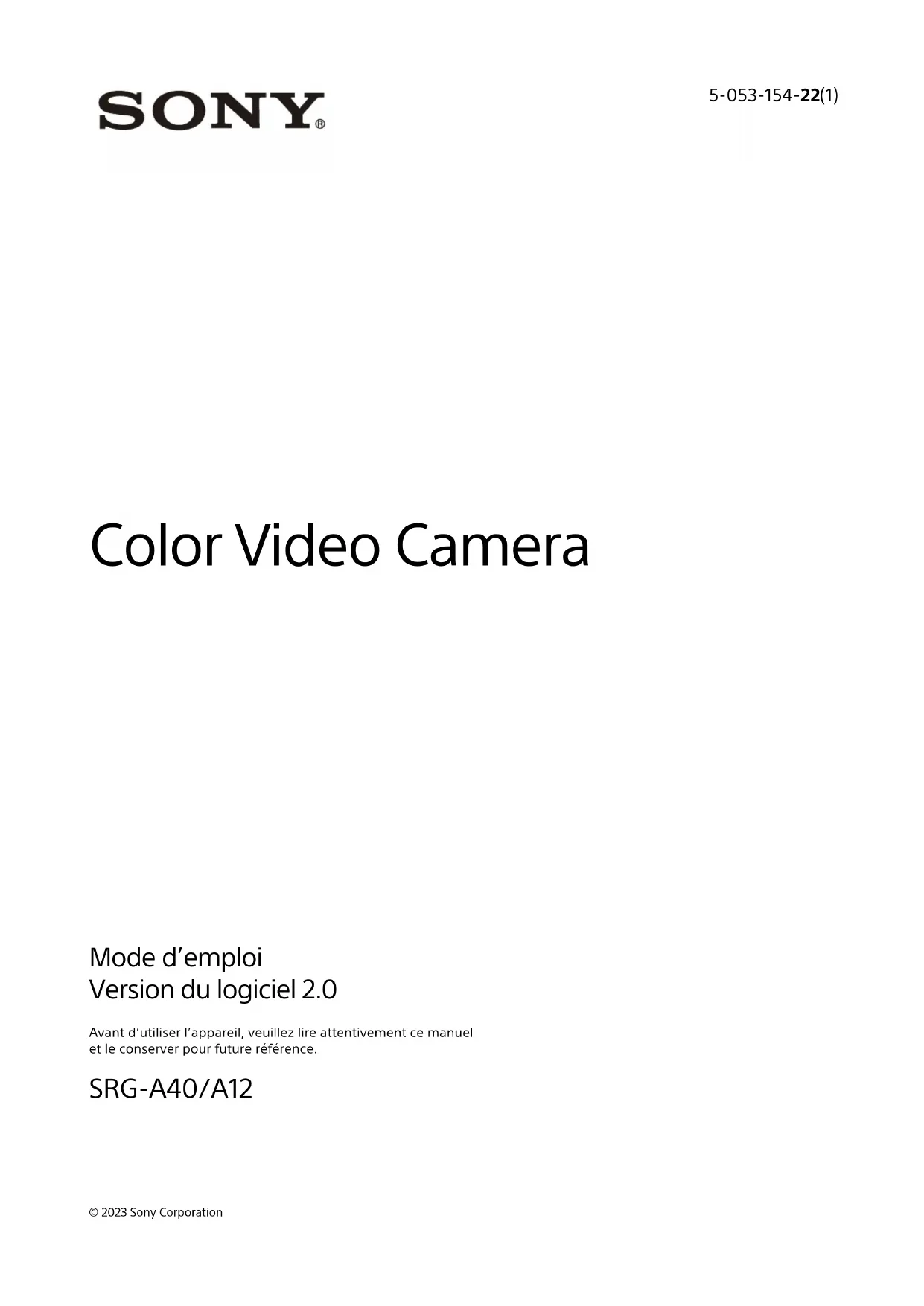 - Color Video Camera Mode d’emploi Version du logiciel 2.0 Avant d’utiliser l’appareil, veuillez lire attentivement ce manuel et le conserver pour future référence. SRG-A40/A12 5-053-154-22(1) © 2023 Sony Corporation2 Table des matières Description générale Utilisation de ce manuel p. 5