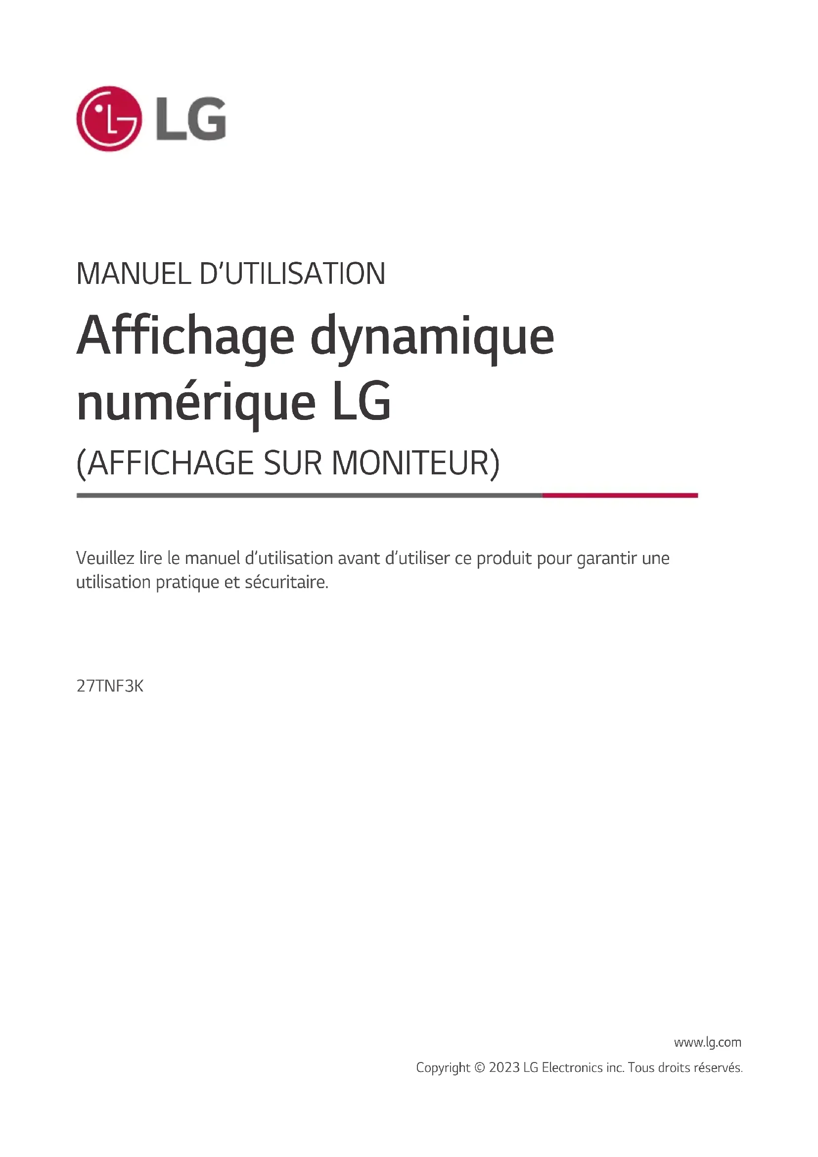 Affichage dynamique numérique LG (AFFICHAGE SUR MONITEUR) 27TNF3K www.lg.comCopyright © 2023 LG Electronics inc. Tous droits réservés. Veuillez lire le manuel d’utilisation avant d’utiliser ce produit pour garantir une utilisation pratique et sécuritaire.2 FRANÇAIS