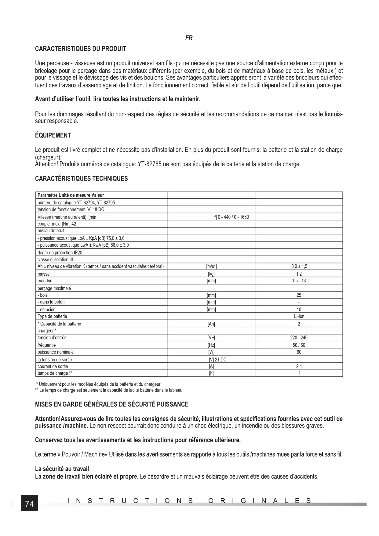 - Uniquement pour les modèles équipés de la batterie et du chargeur ** Le temps de charge est seulement la capacité de ladite batterie dans le tableau MISES EN GARDE GÉNÉRALES DE SÉCURITÉ PUISSANCE Attention!Assurez-vous de lire toutes les consignes de sécurité, illustrations et spécifi cations fournies avec cet outil de puissance /machine. Le non-respect pourrait donc conduire à un choc électrique, un incendie ou des blessures graves. Conservez tous les avertissements et les instructions pour référence ultérieure. Le terme « Pouvoir / Machine« Utilisé dans les avertissements se rapporte à tous les outils /machines mues par la force et sans fi l. La sécurité au travail La zone de travail bien éclairé et propre. Le désordre et un mauvais éclairage peuvent être des causes d’accidents.75 INSTRUCTIONS ORIGINALES