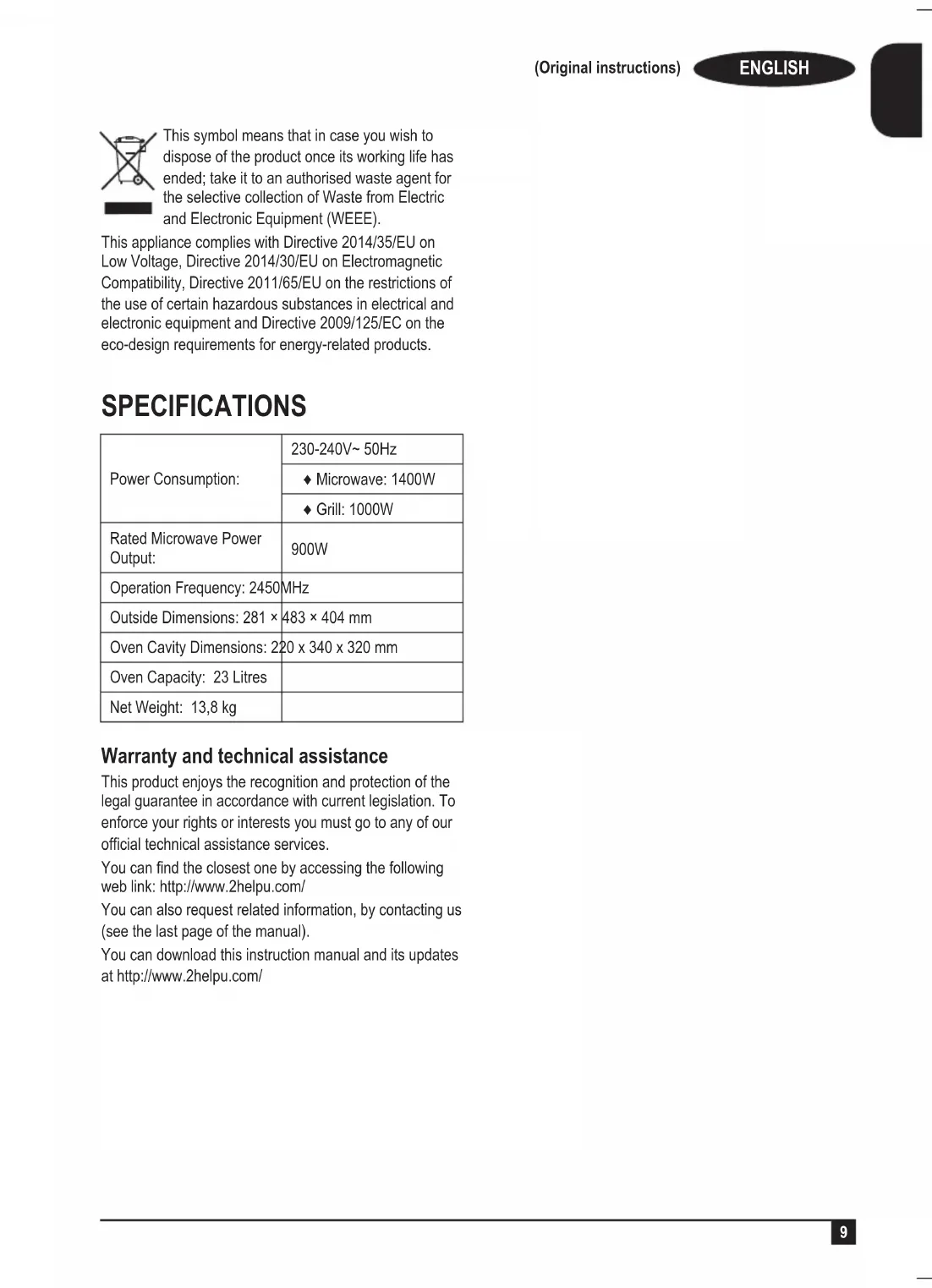 ♦ En cas de panne, remettre l’appareil à un service d’assistance technique agréé. Il est dangereux de tenter de procéder aux réparations ou de démonter l’appareil soi-même. Pour les versions UE du produit et/ou en fonction de la législation du pays d’instal- lation : Écologie et recyclage de l’appareil. ♦ Les matériaux constituant l’emballage de cet appareil font partie d’un programme de collecte, de tri et de recyclage. Pour vous débarrasser du produit, merci de bien vouloir utiliser les conteneurs publics appropriés à chaque type de matériau. ♦ Le produit ne contient pas de substances concentrées susceptibles d’être considérées comme nuisibles à l’environnement. Ce symbole signie que si vous souhaitez vous débarrasser de l’appareil, en n de vie utile, celui-ci devra être déposé, en prenant les mesures adaptées, à un centre agréé pour la collecte et le tri des déchets d’équipements électriques et électroniques (DEEE). Cet appareil est certié conforme à la directive 2014/35/ EU de basse tension, de même qu’à la directive 2014/30/ EU en matière de compatibilité électromagnétique, à la di- rective 2011/65/EU relative à la limitation de l’utilisation de certaines substances dangereuses dans les équipements électriques et électroniques et à la directive 2009/125/EC sur les conditions de conception écologique applicable aux produits en rapport avec l’énergie. SPÉCIFICATIONS Consommation : 230-240 V~ 50 Hz Micro-ondes : 1400 W Grill: 1000 W Puissance de sortie du micro-ondes 900 W Fréquence en fonction- nement : 2450 MHz Dimensions extérieures : 281 × 483 × 404 mm Dimensions intérieures : 220 x 340 x 320 mm Capacité du micro-ondes : 23 litres Poids net : 13,8 kgFRANÇAIS Traduit des instructions originales