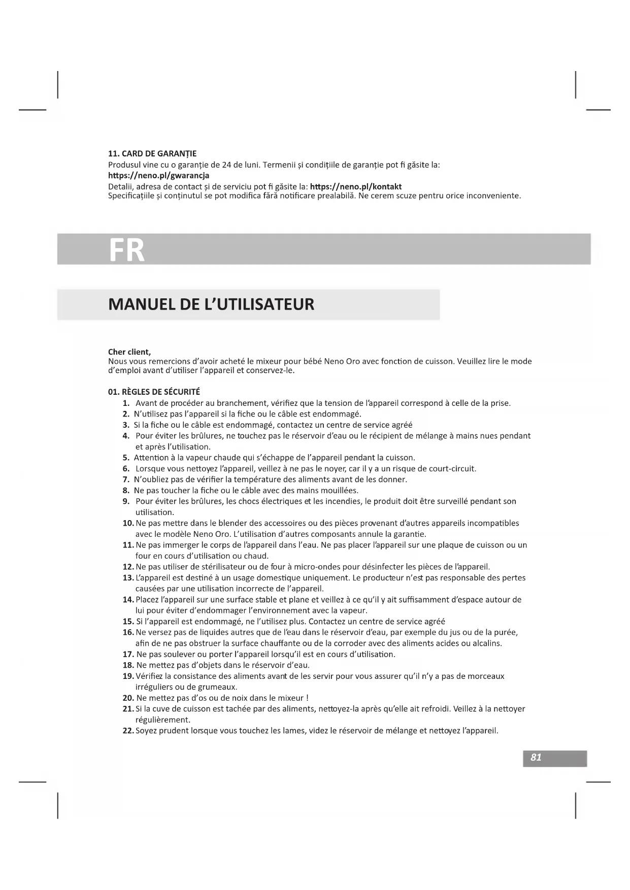 Cher client, Nous vous remercions d’avoir acheté le mixeur pour bébé Neno Oro avec foncon de cuisson. Veuillez lire le mode d’emploi avant d’uliser l’appareil et conservez-le.