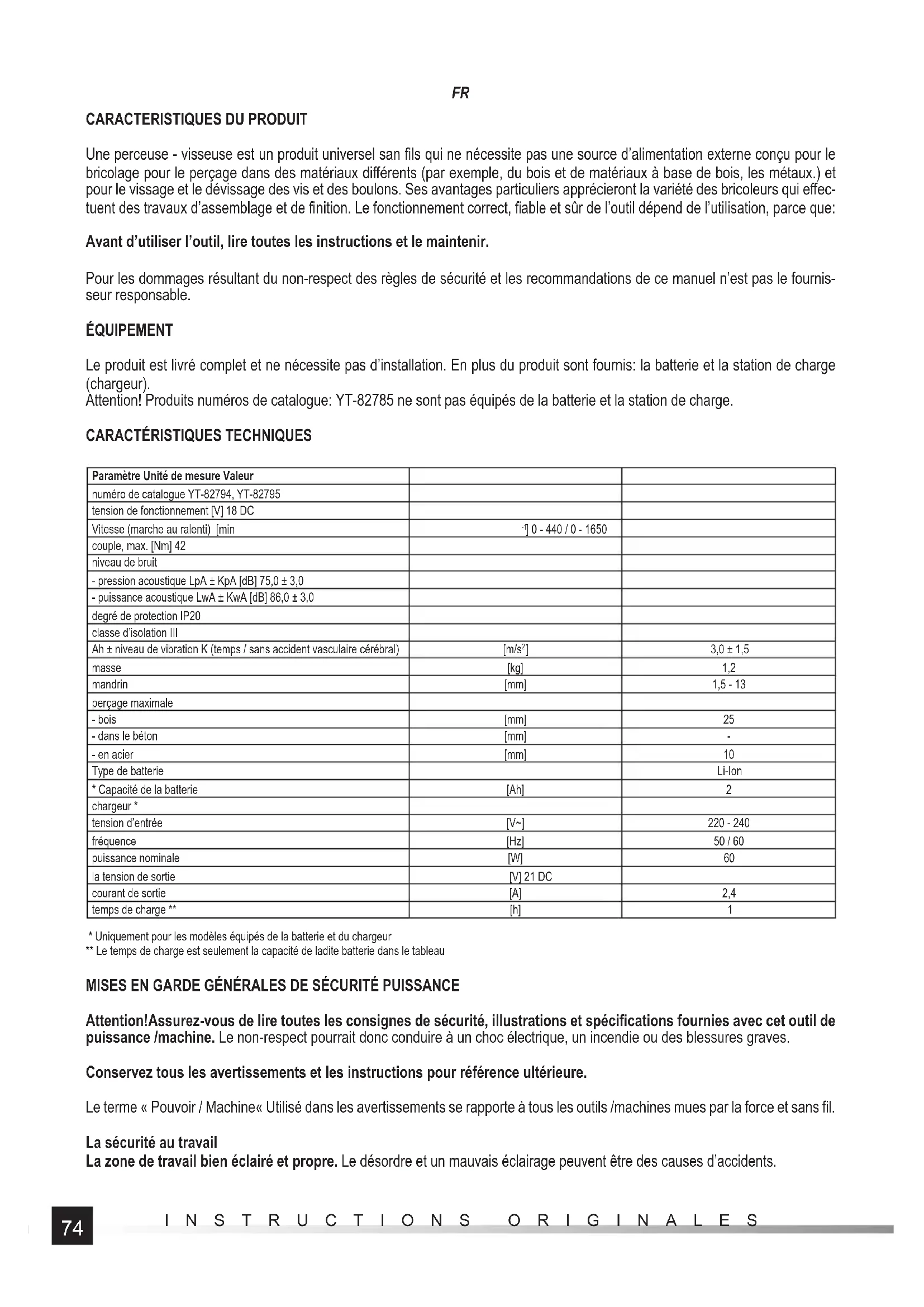- Uniquement pour les modèles équipés de la batterie et du chargeur ** Le temps de charge est seulement la capacité de ladite batterie dans le tableau MISES EN GARDE GÉNÉRALES DE SÉCURITÉ PUISSANCE Attention!Assurez-vous de lire toutes les consignes de sécurité, illustrations et spécifi cations fournies avec cet outil de puissance /machine. Le non-respect pourrait donc conduire à un choc électrique, un incendie ou des blessures graves. Conservez tous les avertissements et les instructions pour référence ultérieure. Le terme « Pouvoir / Machine« Utilisé dans les avertissements se rapporte à tous les outils /machines mues par la force et sans fi l. La sécurité au travail La zone de travail bien éclairé et propre. Le désordre et un mauvais éclairage peuvent être des causes d’accidents.75 INSTRUCTIONS ORIGINALES