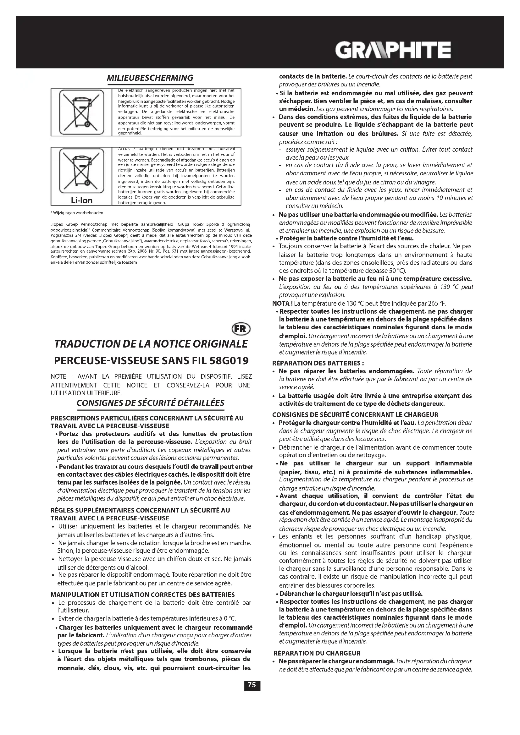 Ouverture du mandrin à serrage rapide 2-13 mm Plage de réglage du couple 1 – 16 + perçage Couple max. (vissage mou) 38 Nm Couple max. (vissage dur) 58 Nm Classe de protection III Poids 1,2 kg Année de fabrication 2021 58G019 indique le type et l’identication de l’appareil Batterie Graphite Energy+ Paramètre Valeur78 Batterie 58G001 58G004 Tension de la batterie 18 V DC 18 V DC Type de batterie Li-Ion Li-Ion Capacité de la batterie 2000 mAh 4000 mAh Plage de température ambiante 4